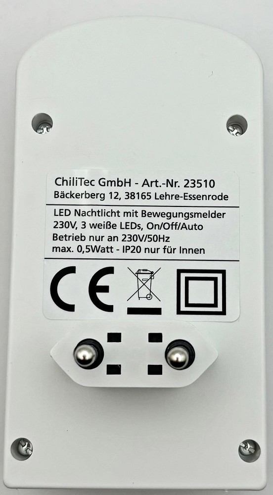 ChiliTec LED Nachtlicht mit Bewegungsmelder 230V, Licht Warmweiß, On/Off/Auto