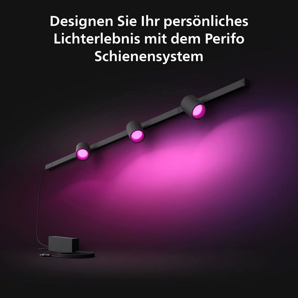 Die Philips Hue Perifo Serie ist eine moderne und ausdrucksstarke Wandlampe und Deckenleuchte, die eine entspannte Atmosphäre in jedem Raum schaffen kann. Dieses Schienenbeleuchtungsset für besteht aus drei Zylinderspots, einer 1 Meter langen Schiene, einem geraden Steckverbinder und einem Netzteil mit Netzstecker am Ende einer Schiene.