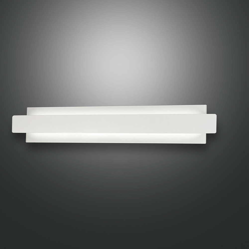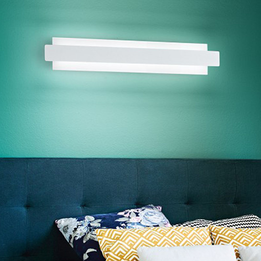 Die Leuchte hat ein langes, horizontales Rechteck aus Metall mit warmweißen LEDs auf der Rückseite, die die umgebende Wand effektiv und gleichzeitig angenehm beleuchten.
