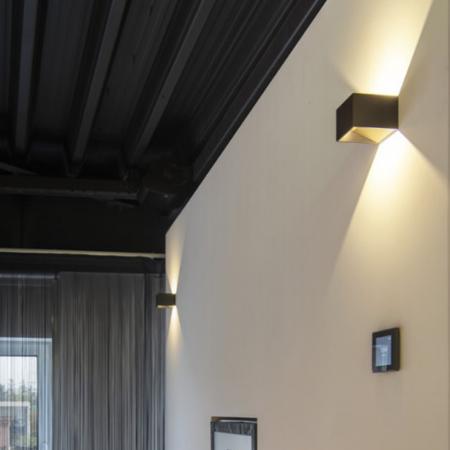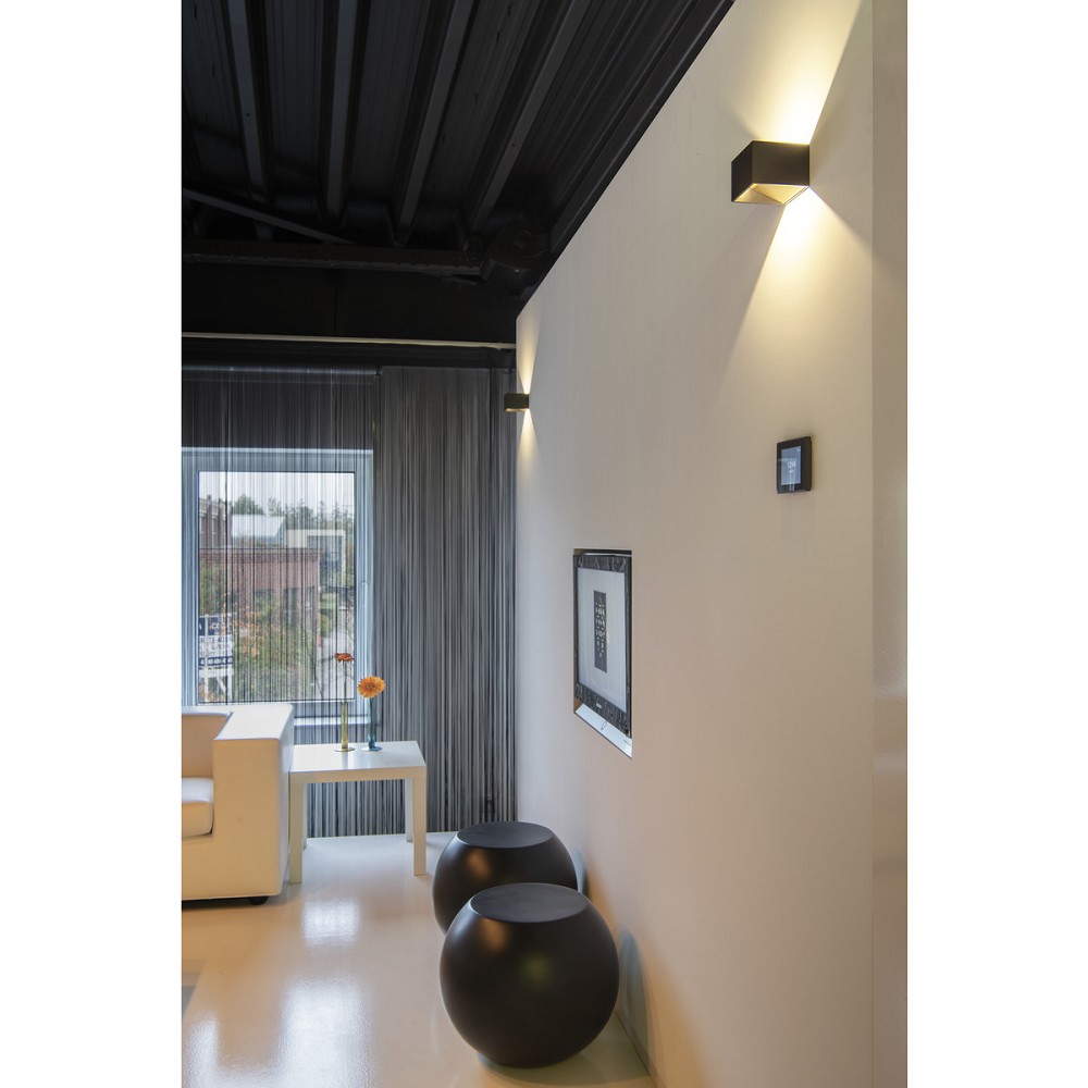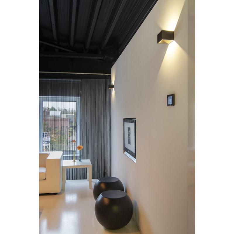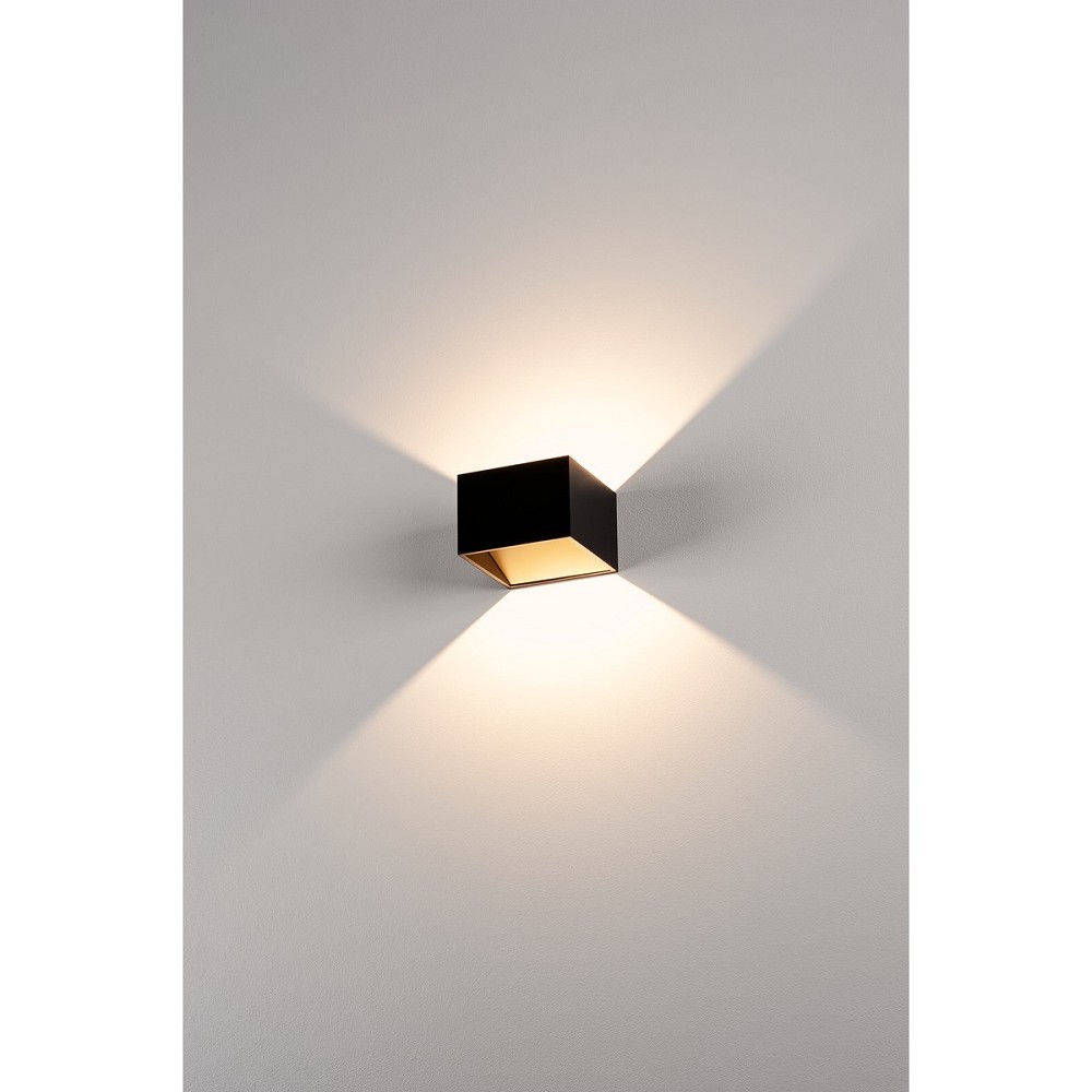 Würfelförmige schlichte gestaltete LED Wandleuchte in schwarz/messing mit Dim to Warm Funktion