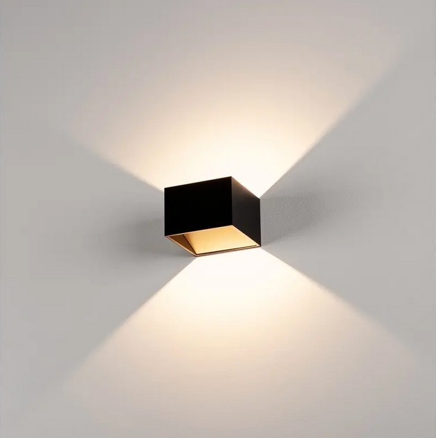 Würfelförmige minimalistische Wandleuchte LOGS in schwarz/gold inkl. warmweißer LED