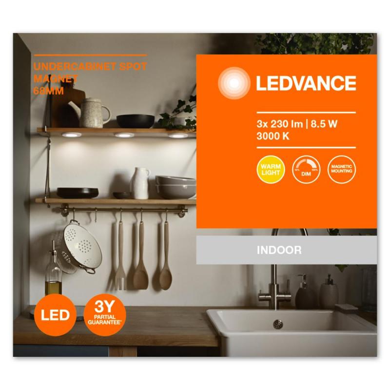 Unterbauleuchten bieten eine einfache und effektive Möglichkeit, Ihre Küche zu beleuchten. Die LED-Magnet-Leuchten ist eine einfache Möglichkeit, Ihre Arbeitsplatte zu beleuchten. Das Set besteht aus drei LED-Spots, die unabhängig voneinander platziert werden können, und ist mit einem kurzen Anschlusskabel und einer Klemme für die feste Verdrahtung mit 230 V ausgestattet. Die LED-Treiber sind in den Spots integriert.