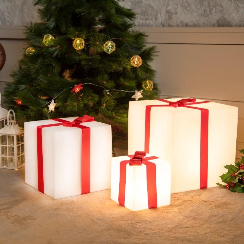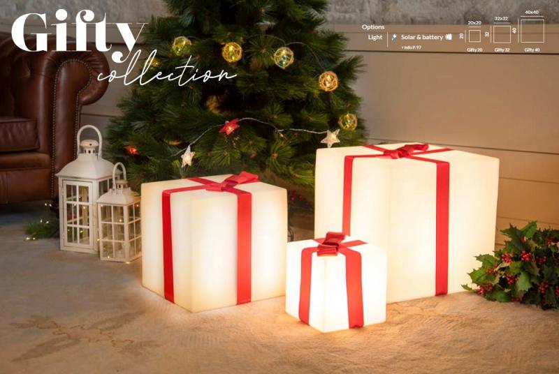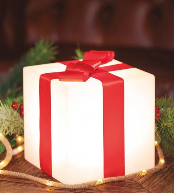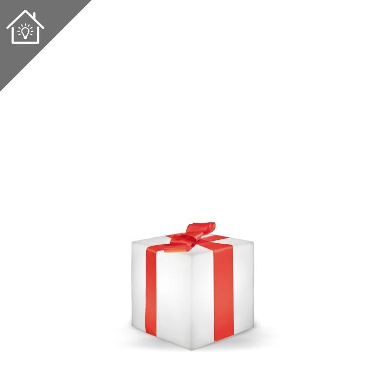 Der GIFTY Würfel ist da, eine Lampe und ein Beistelltisch in einer quadratischen Form mit einer Schleife, um in der Weihnachtszeit Ihr Hause gemütlich oder festlich zu dekorieren - mal auf eine neue unkonventioneller Art. Der Würfel strahlt ein weißes oder wahlweise per Fernbedienung steuerbar farbiges Licht aus und wird mit einer wiederauffladbaren Batterie versorgt. Der Würfel eignet sich beispielsweise als Design-Highlight neben der Couch, als Blickfang auf der Terrrasse / Balkon oder im Eingangsbereich oder als Wegbeleuchtung im Garten. GIFTY verleiht Ihrem Zuhause einen vorweihnachtlichen Touch. Perfekt für Diejenigen, die das gewisse Extra im Interieur bevorzugen.