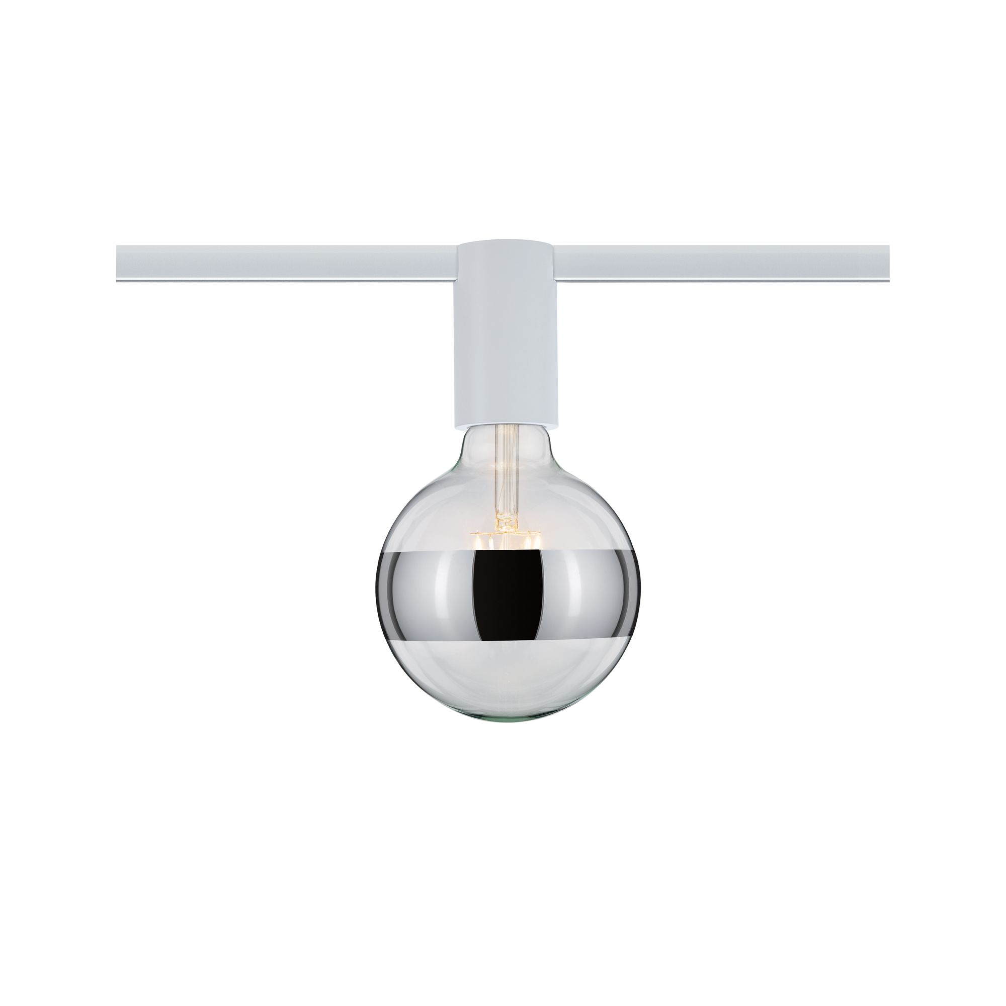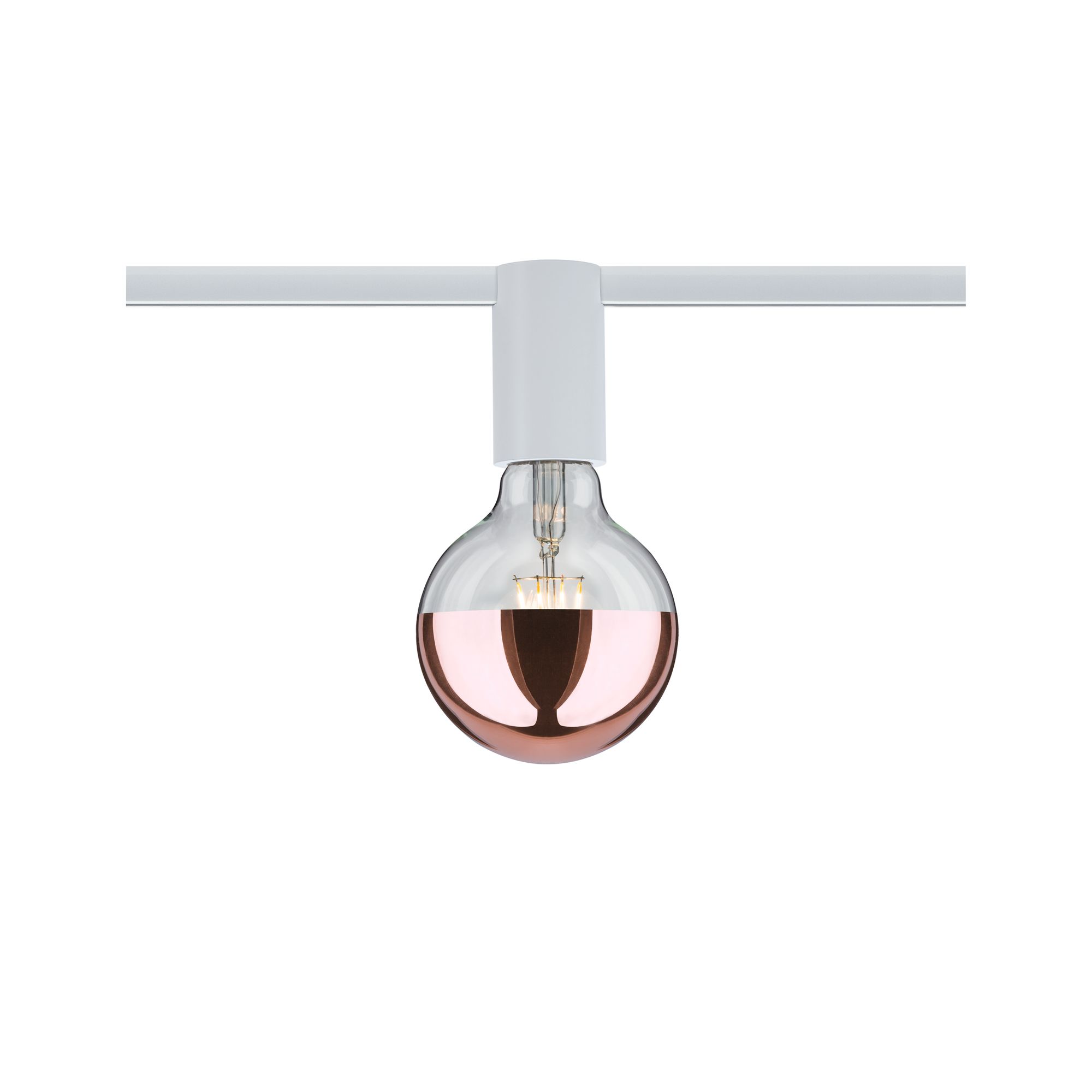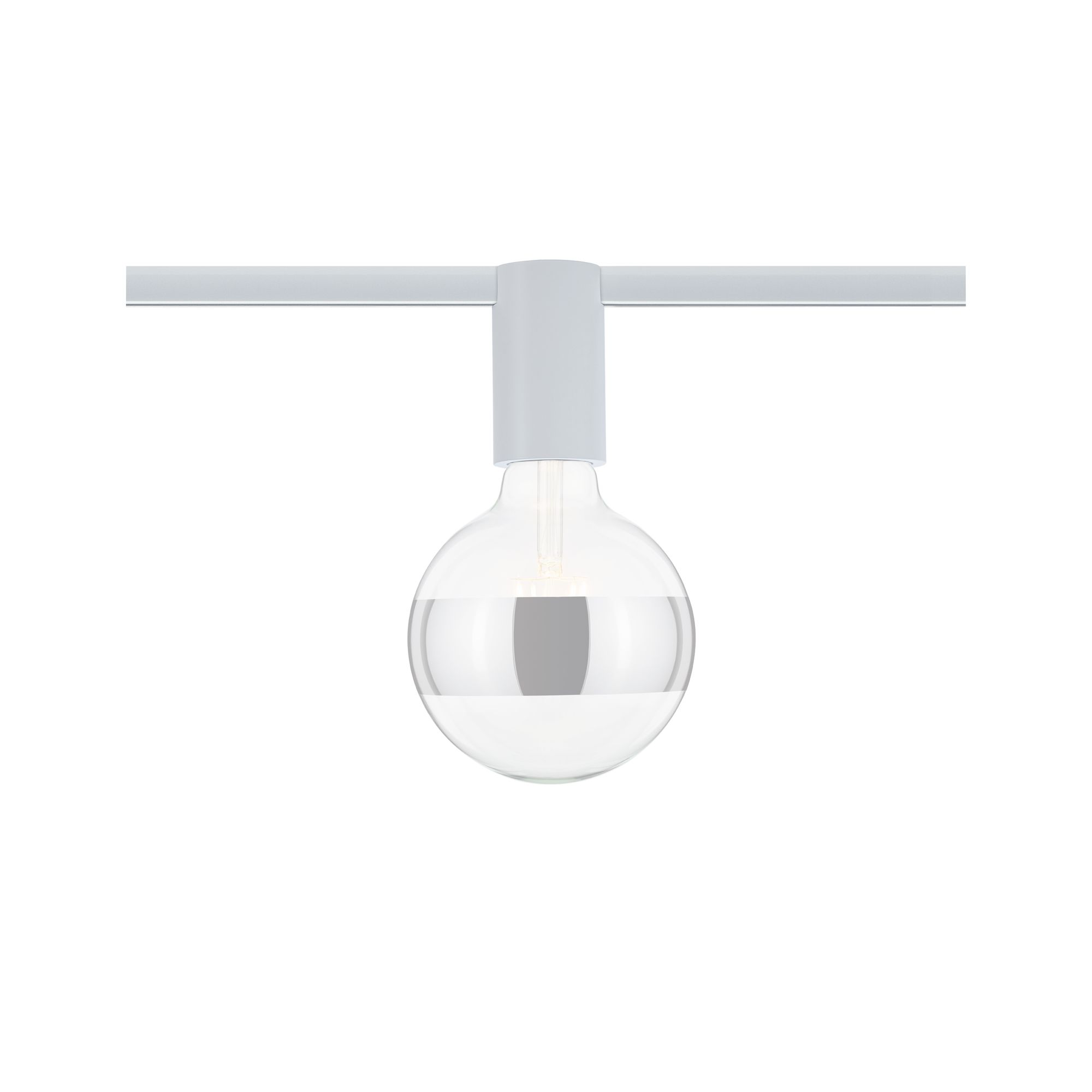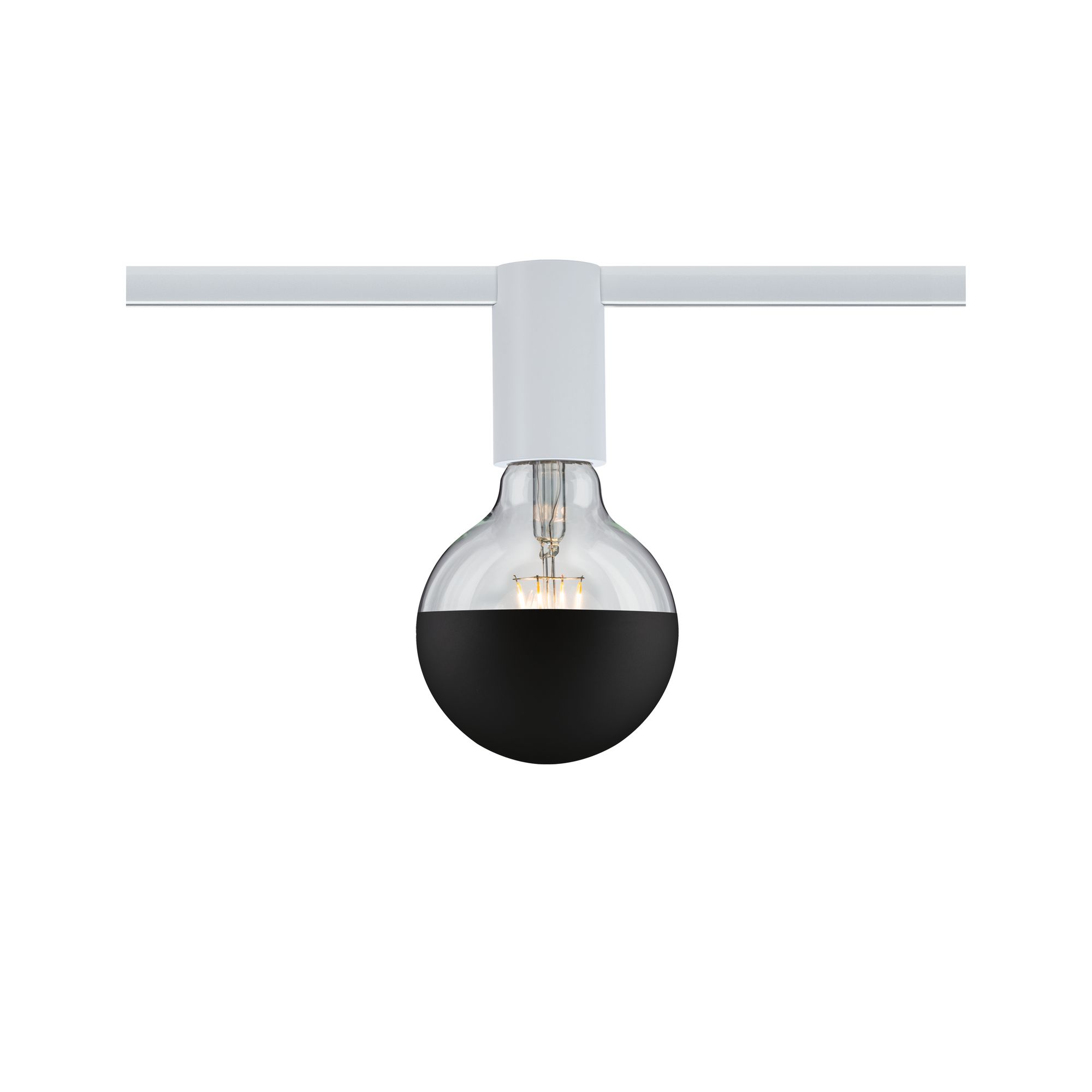 Der URail Spot Ceiling Socket in der Farbe Weiß eignet sich speziell für die Kombination mit dekorativen Leuchtmitteln wie Kopfspiegel- und Filamentlampen. Die innenliegende E27-Fassung und die Schienenaufnahme verschwinden unsichtbar hinter einer Metallabdeckung.