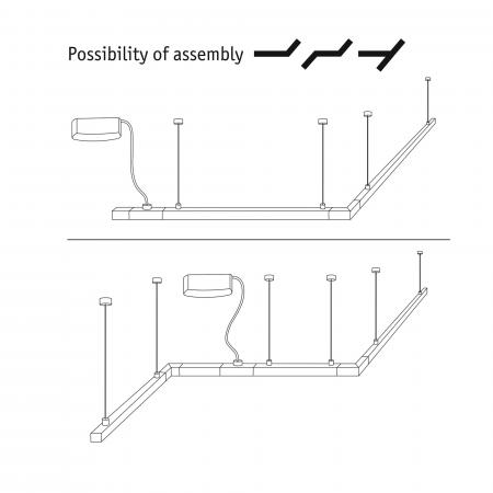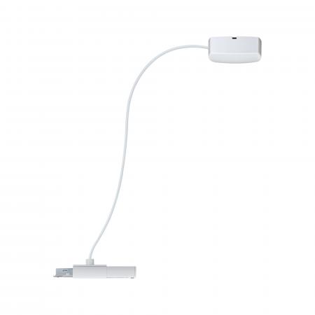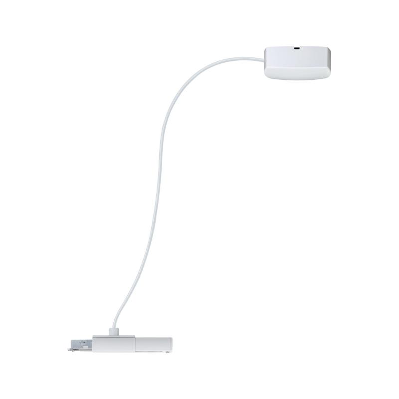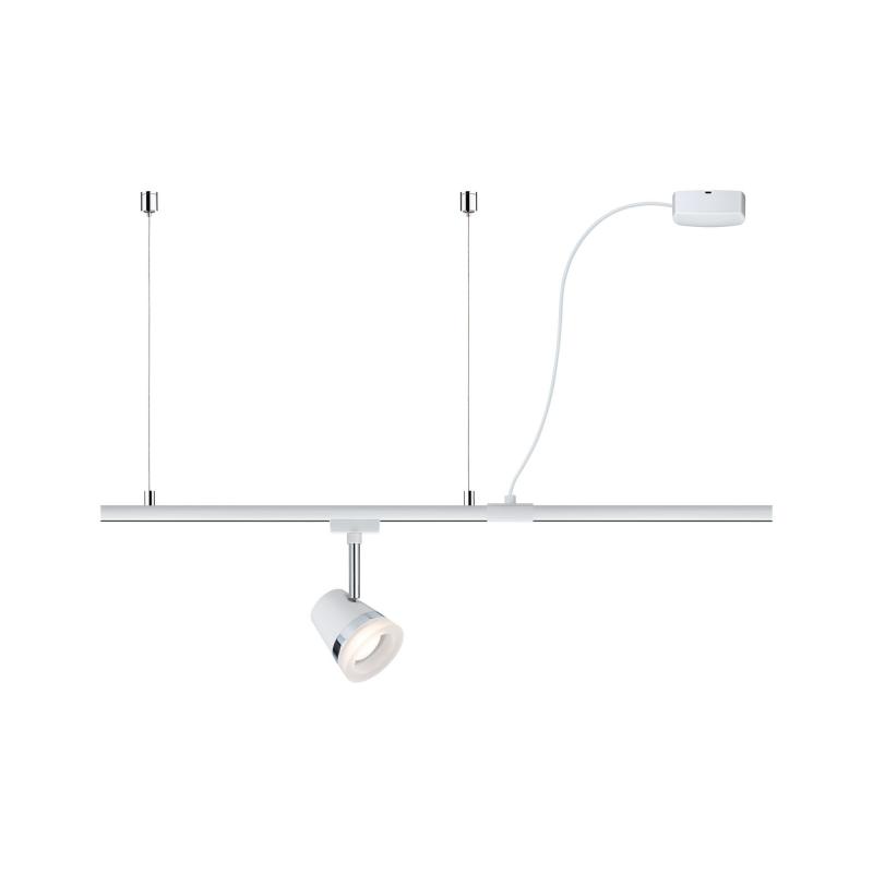 Die 230 Volt hängende Einspeisung in Weiß ermöglicht eine Lichtinstallation für bis zu 2m am Seil abgehängte Systeme. Dies ermöglicht eine Installation an hohen Decken, da sich die Lichtquelle tiefer in den Raum anbringen lässt. Die Flexibilität in der Raumgestaltung durch ein Schienensystem geht dabei nicht verloren. Wir empfehlen bei der Schienenanordnung mindestens eine L-Form, besser eine Z- oder U-Form zu bauen. Andernfalls sind nur rotationssymmetrische Leuchten möglich, da sonst die Schiene am Seil kippt.