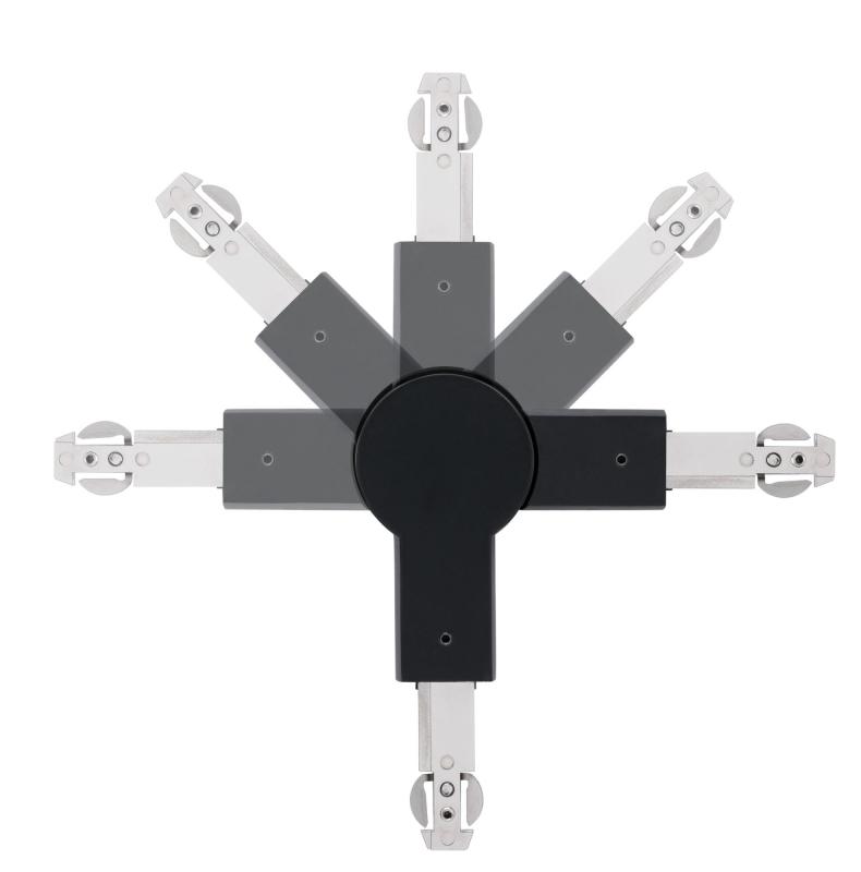 Mit dem schwarzen Gelenkverbinder lassen sich zwei Urail-Schienen in einem Winkel bis maximal 90° miteinander verbinden. Der Verbinder wird dazu einfach in die Schienen gesteckt. Dank des einheitlichen Designs von Schienen und Verbindern sind die Übergänge kaum sichtbar.