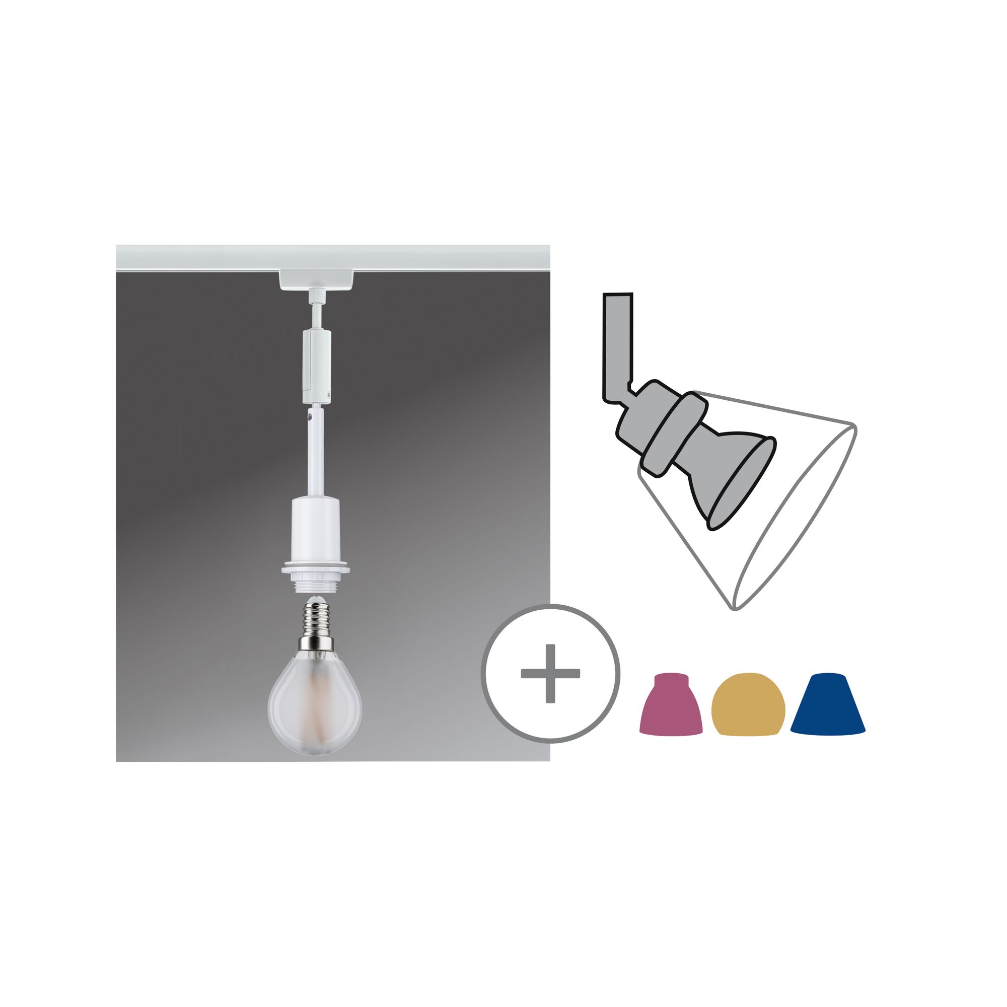 Das URail DecoSystems Pendel in Weiß mit einem Stoffkabel bietet volle Flexibilität bei der Auswahl des Lampenschirms und des Leuchtmittels. Es kann mit einem beliebigen DecoSystems-Schirm ausgestattet und einem E14-Leuchtmittel bestückt werden. Auf diese Weise bekommen die Leuchten eine ganz persönliche Note. In Kombination mit weiteren Leuchten aus dem URail Sortiment lässt sich so ein ganz individuelles Schienensystem bis zu einer Gesamtleistung von max. 1000 Watt erstellen.