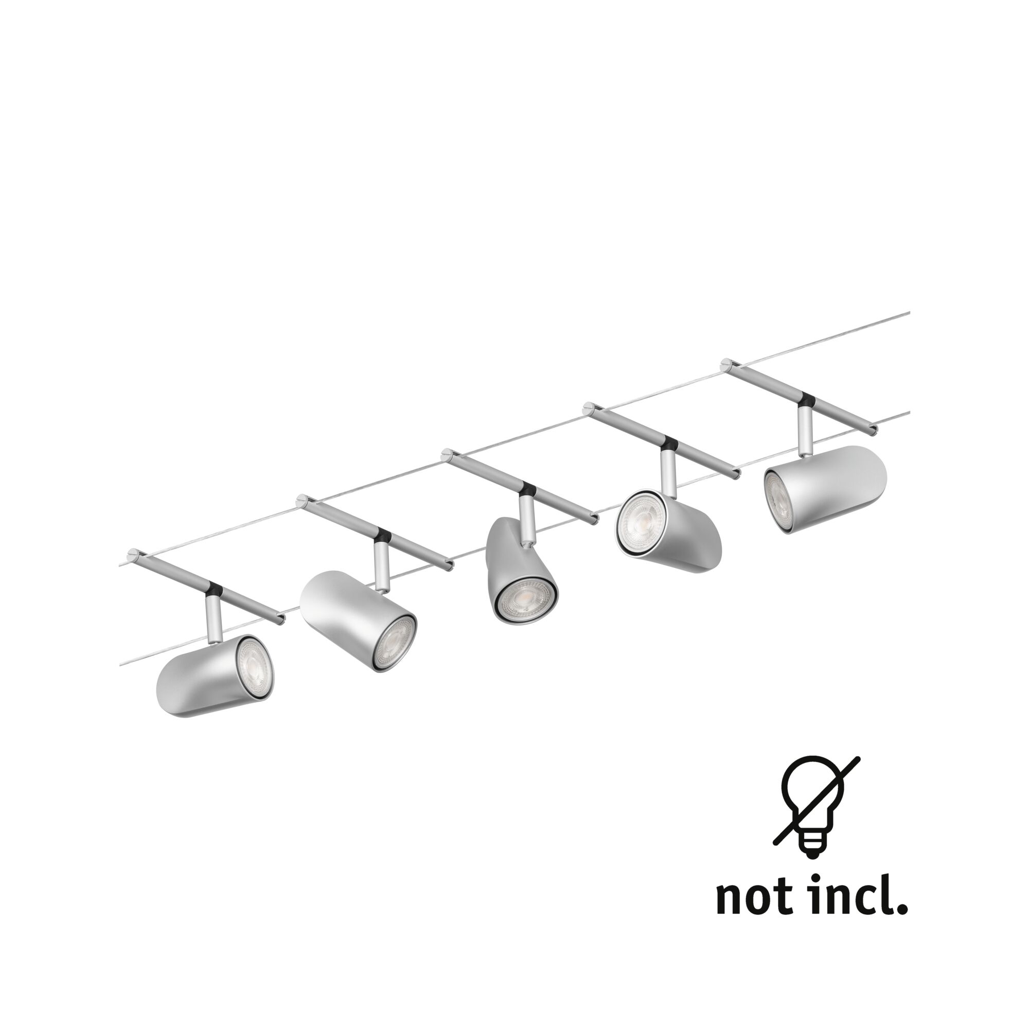 Die Serie Cup in Chrom matt,Chrom mit 5 Spots ohne Leuchtmittel kann sowohl an der Wand als auch an der Decke montiert werden und bietet dadurch grenzenlose Gestaltungsmöglichkeiten. Egal ob gerade, schräg oder verwinkelt - Seilsysteme passen in jeden Raum und sind die Problemlöser für schwierige Installationsbedingungen. Das Basisset lässt sich individuell durch Einzelspots, Umlenker und weiteres Zubehör ergänzen. Das Seil mit einer Länge vom 10 m, kann in der Mitte geteilt werden, sodass das System auf max. 5 m gespannt werden kann. Mit diesem System lässt sich eine optimale Lichtverteilung realisieren, bei steigendem Lichtbedarf lässt es sich problemlos erweitern. Für die Verteilung der Leuchten im gesamten Raum wird nur ein Stromauslass benötigt. Systeme mit der Technik 12V DC (Gleichspannung) lassen sich nicht über einen Wand-Einbaudimmer dimmen.
