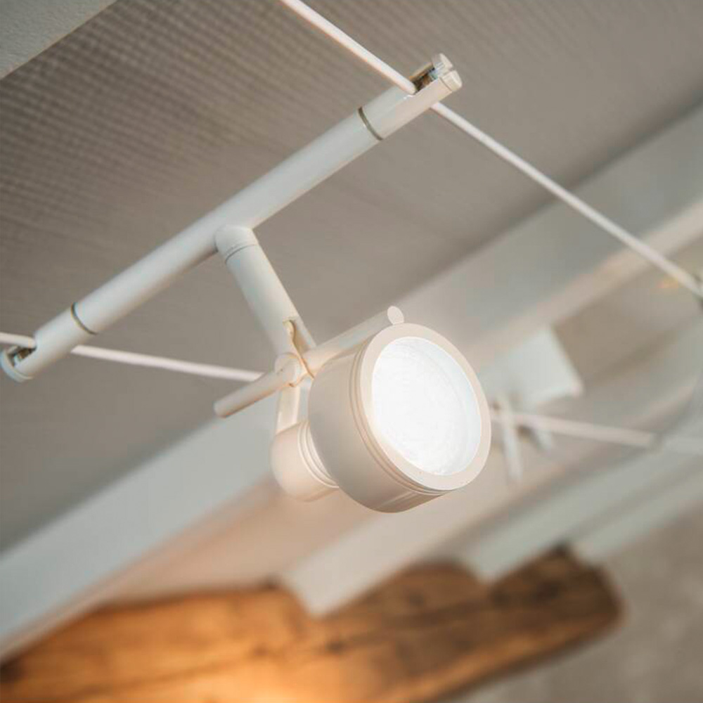 Aus Stahl bestehender, dreh- und schwenkbarer Strahler SALUNA für das Niedervolt Seilsystem. Durch den verbauten GU5.3 Sockel ist der Strahler für Halogen- sowie LED-Leuchtmittel geeignet. Der maximal kompatible Seilabstand beträgt 15,5 cm. Diese Leuchte ist geeignet für Leuchtmittel der Energieklassen: C - A+