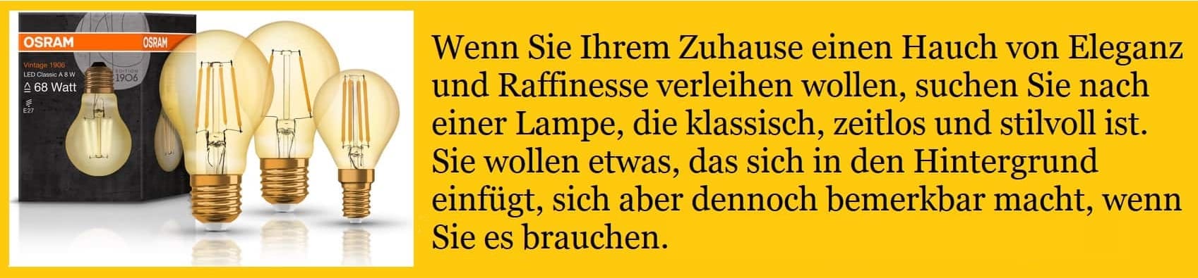 Die so bezeichneten Lampen und Leuchtmittel orientieren sich am Zeitgeist des beginnenden 20. Jahrhunderts. Dieser Style galt vor ca. 100 Jahren als modern. Geläufig sind auch andere Bezeichnungen für diesen Stil: Shabby-Chic oder Used-Look. Die Objekte, vor allem die Möbel, wirken etwas abgenutzt. Das ist Absicht. Bei den Vintage-Leuchtmitteln kann man keinen Used-Look erzeugen. Allein die Form und der „Glühdraht“ lassen die alte Zeit erkennen. Mit den Vintage-LED-Leuchtmitteln lassen wir die alte Zeit fast originalgetreu wieder ein wenig aufleben. Paasend dazu gibt es Vintage Lampen.