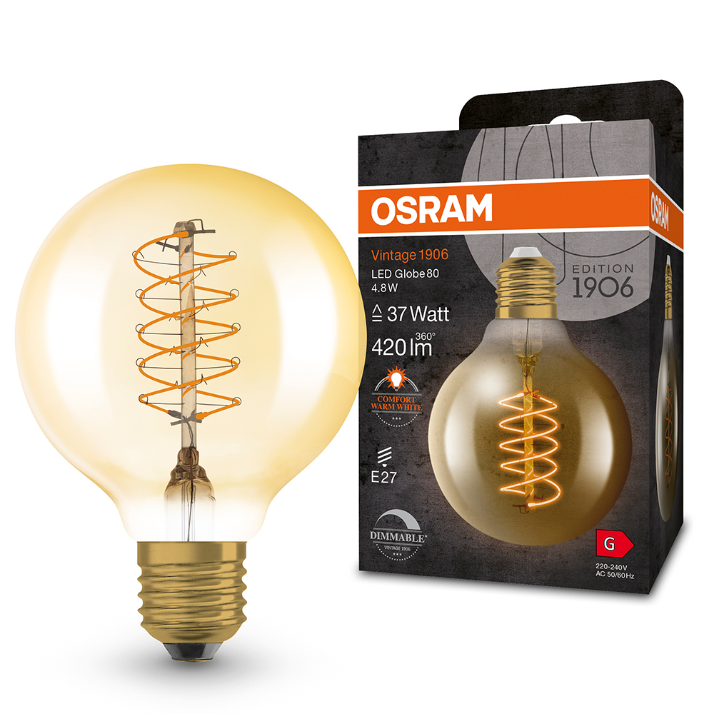 Die OSRAM Edition 1906 bedeutet moderne Lichttechnik aus hochwertigen Materialien im Vintage-Look. Klassische Lampenformen werden mit modernster Filament Technologie vereint. Die Edition 1906 ist nach dem Jahr der Eintragung des Warenzeichens „Osram“ und orientiert sich am klaren Industriedesign der damaligen Zeit.
