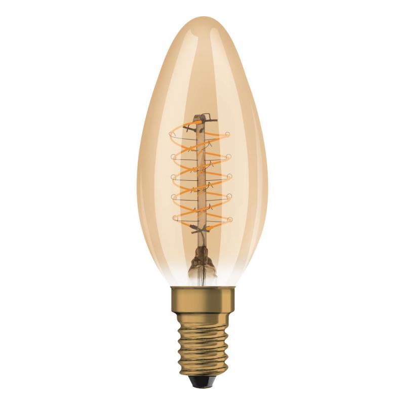 Die Vintage 1906 E14-Lampe in Form einer Kerze ist aus Glas und goldiger Farbe und bietet eine warmweiße Lichtfarbe mit 2.200 Kelvin. Mit einem Vergleichswert von 25 Watt im Vergleich zu herkömmlichen Glühlampen ist sie eine energieeffiziente Option. Weitere Vorteile der Vintage 1906 sind ihr Abstrahlwinkel von 320° und eine Helligkeit von 250 Lumen bei nur 3,4 Watt. Die sichtbaren Glühfäden verleihen dieser Glühlampe einen Vintage-Look, der sich perfekt für retro-gestaltete Räume eignet. Sie ist dimmbar, so dass dias Licht an die individuellen Bedürfnisse angepasst werden kann.