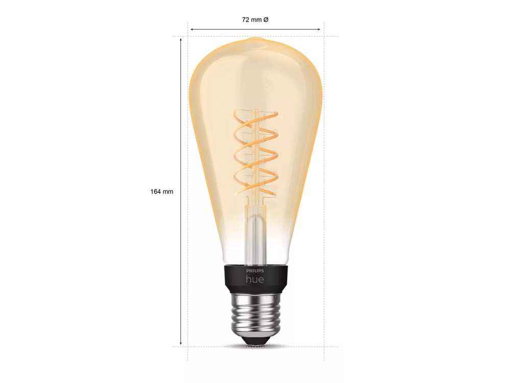 Die größere Ausführung der länglichen Edison-Filament-Lampe im ST72-Design ist eine moderne Lampe im traditionellen Stil: Sie ist bluetoothfähig, verfügt über einen gewickelten Glühfaden und eine elegante, bernsteinfarbene Beschichtung. Verwende sie mit Bluetooth oder verknüpfe sie mit einer Hue Bridge, um weitere smarte Lichtfunktionen zu nutzen.