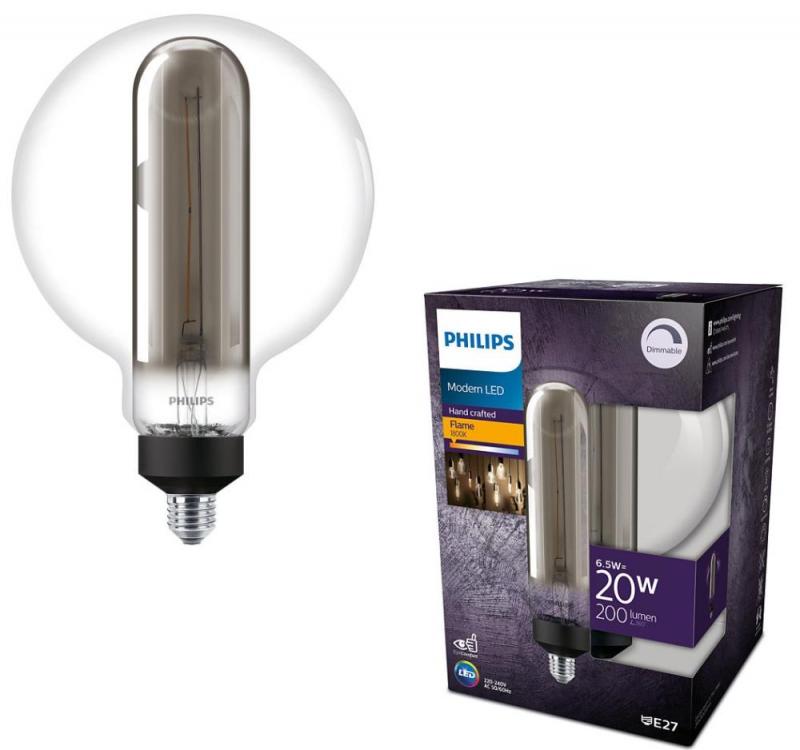 Die LED-Lampe besteht aus einer zweischichtigen LED-Lampe, die aus einem rauchfarben getönten Glaskolben besteht, in dem warmweiße LEDs in Glühfadentechnik untergebracht sind. Diese Röhre wiederum sitzt in einem klaren Glas runde Kugelform.