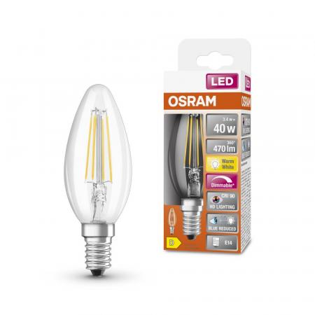 Kerzenförmige LED von Osram mit einem E14 Gewinde und warmweißem Licht. Dieses LED-Leuchtmittel ist dimmbar und verbraucht 3,4 Watt bei einer Lichtausbeute von 470 Lumen.
