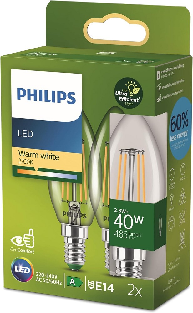 Diese Philips UltraEfficient LED vereint klassische Kerzenoptik mit modernster Effizienz. Mit bis zu 50 % Energieeinsparung gegenüber herkömmlichen LEDs, warmweißem Licht (2700 K) und einer Lebensdauer von bis zu 50.000 Stunden ist sie ideal für stilvolle und langlebige Beleuchtungslösungen im Innenbereich.