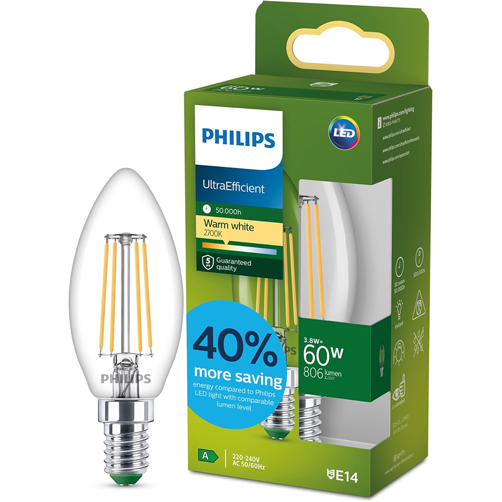 Die Philips UltraEfficient LED-Lampe E14 ist eines der energieeffizientesten LED-Leuchtmittel von Philips. Sie spart bis zu 40 % mehr Energie als herkömmliche Philips LEDs und überzeugt gleichzeitig durch eine lange Lebensdauer von bis zu 50.000 Stunden. Dank der integrierten EyeComfort-Technologie ist das Licht augenschonend, angenehm warmweiß mit 2700 K und sorgt für eine gemütliche Lichtstimmung in Wohn- und Arbeitsbereichen. Häufiges Austauschen von Glühlampen entfällt, sodass diese Lampe über viele Jahre hinweg zuverlässig leuchtet.