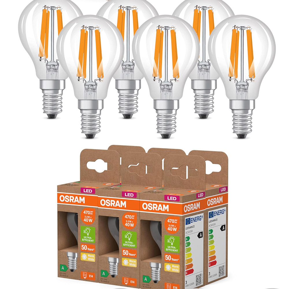 6er Set OSRAM E14 LED Lampe Classic klar 2,2W wie 40W warmweißes Licht 2700K - Energy efficiency class A