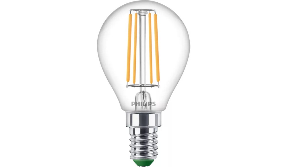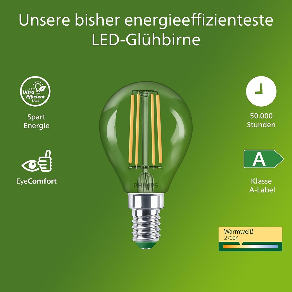 Die Leistung beträgt 3,8 W und entspricht einer herkömmlichen 60 W Glühlampe. Der Energieverbrauch liegt bei 4 kWh pro 1.000 Stunden, Energieeffizienzklasse A. Die Lampe hält bis zu 50.000 Stunden und 500.000 Schaltzyklen, sodass häufiges Ein- und Ausschalten kein Problem darstellt. UltraEfficient-LEDs sparen Energie bei jedem Einschalten und sind mindestens 40 % effizienter als normale Philips LEDs.