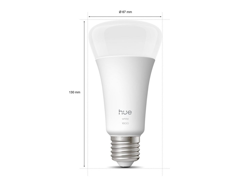 Bringe warmweißes Licht (2700K) in Premium-Qualität mit unserer smarten Lampe in die Beleuchtung Deines Zuhauses. Mit einer maximalen Helligkeit von 1.600 Lumen und dank der Dimmeigenschaften kannst Du Deine Lampe komplett an Deine Bedürfnisse anpassen, indem Du sie mit der Hue App stufenlos von voller Helligkeit bis hinunter zu 5 % einstellst.