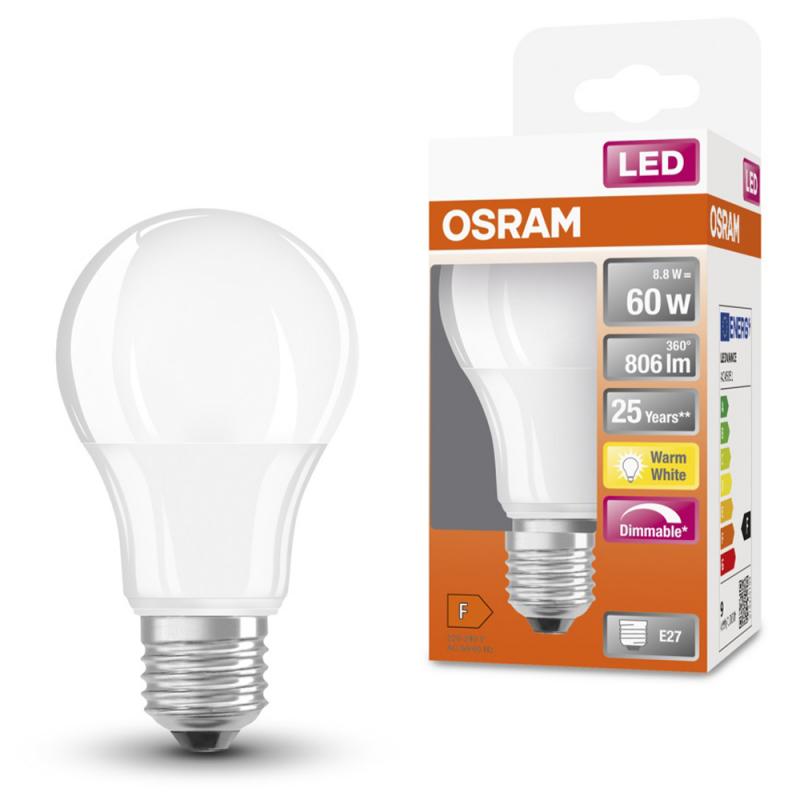 Leistungsstarke LED von Osram mit einem E27 Gewinde und warmweißem Licht. Dieses LED-Leuchtmittel ist dimmbar und verbraucht 8,8 Watt bei einer Lichtausbeute von 806 Lumen.