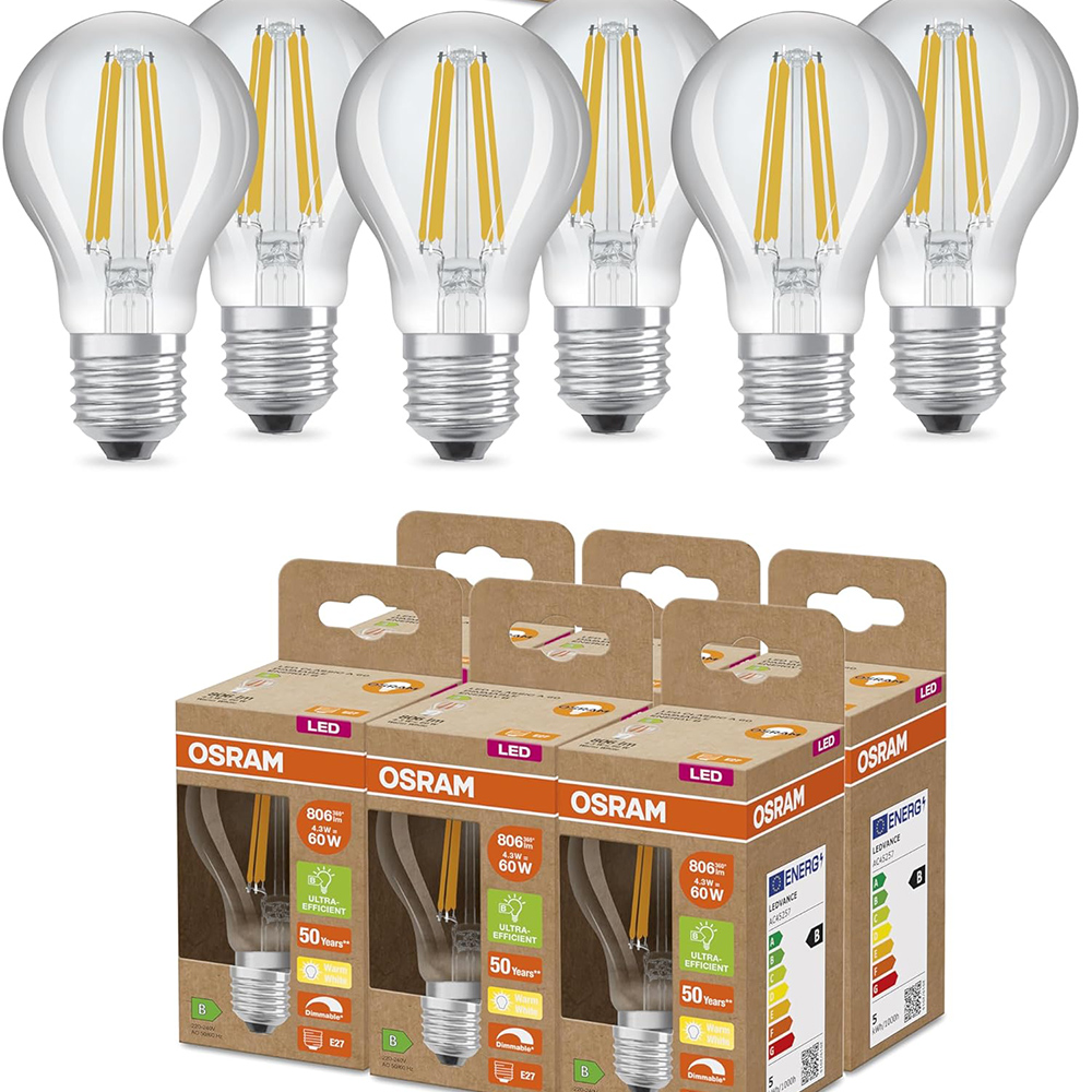 6er Sparset OSRAM E27 SUPERSTAR+ CLASSIC besonders effiziente LED Lampe dimmbar 4,3W wie 60W 2700K warmweißes Licht