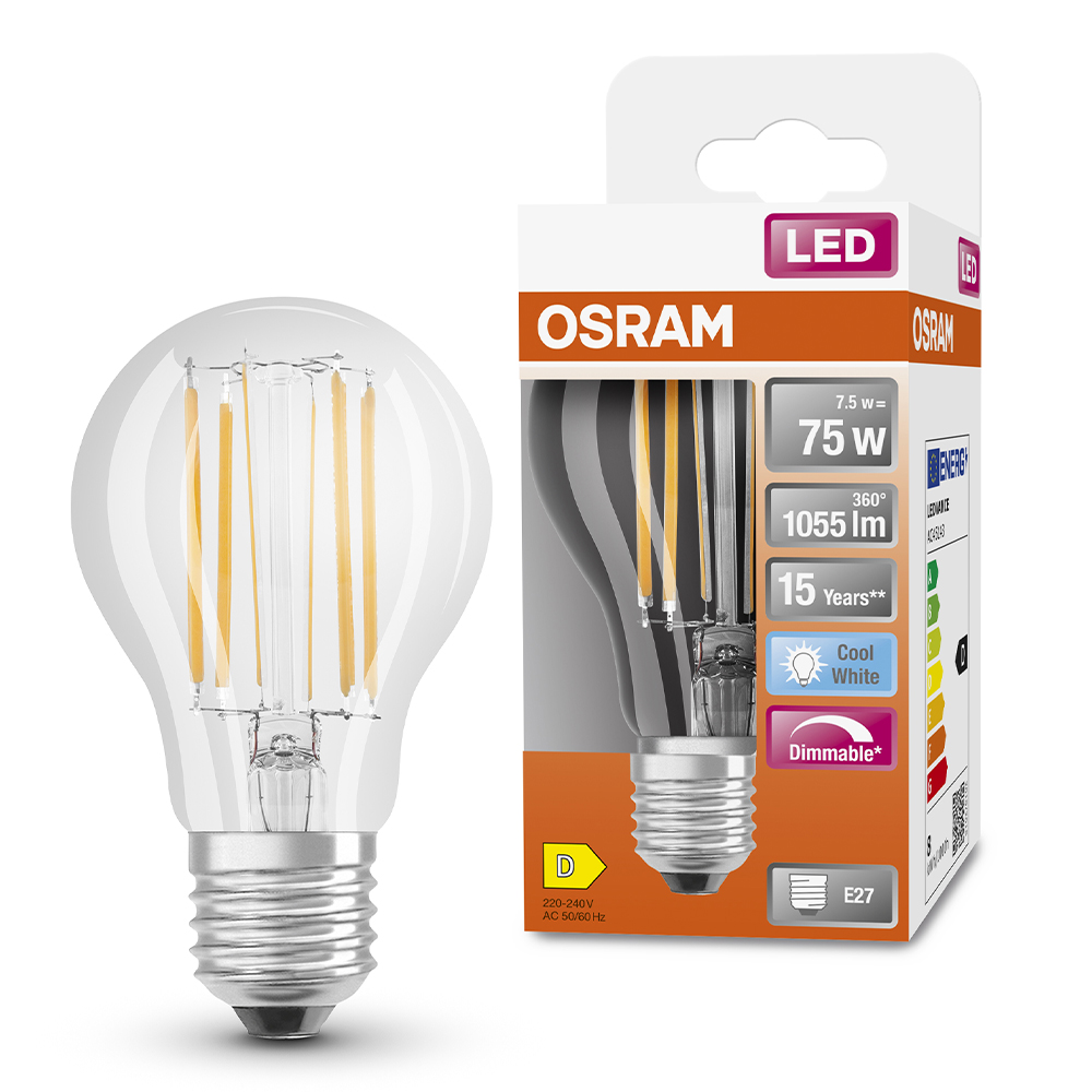 LED als hochwertige Alternative für eine Glühlampe / Glühbirne. Dieses dimmbare Filament LED-Leuchtmittel von Osram verfügt über ein E27 Gewinde und strahlt ein neutralweisses Licht für aus. Die OSRAM-LED verbraucht nur 7,5 Watt, was herkömmlichen 75 Watt entspricht, und dies bei einer guten Lichtausbeute von 1055 Lumen.