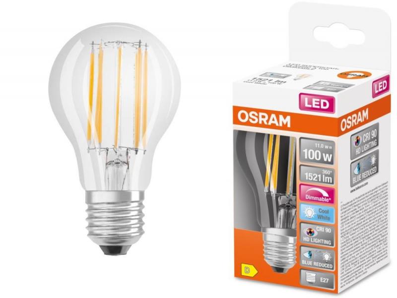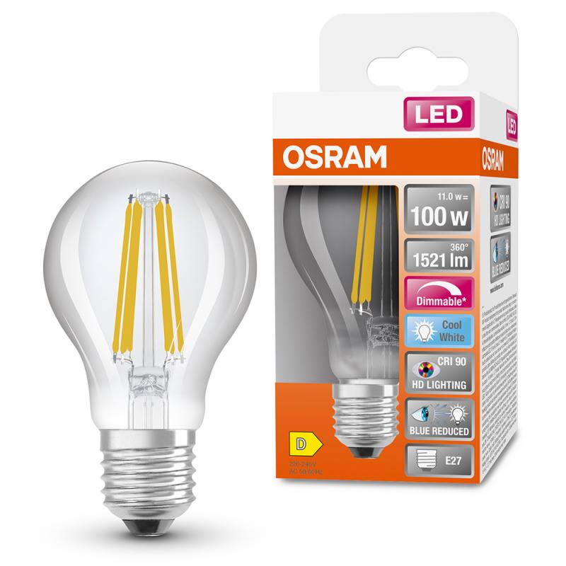Birnenförmige LED von Osram mit einem E27 Gewinde und universalweißem Licht. Dieses LED-Leuchtmittel ist dimmbar und verbraucht 11 Watt bei einer Lichtausbeute von 1521 Lumen.