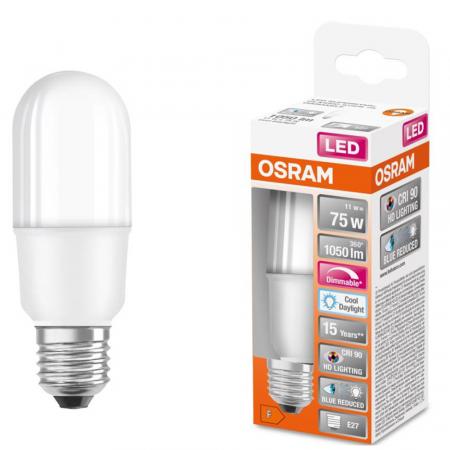 Stickförmige LED von Osram mit einem E27 Gewinde und kalten Licht. Dieses LED-Leuchtmittel ist dimmbar und verbraucht 11 Watt bei einer Lichtausbeute von 1050 Lumen.