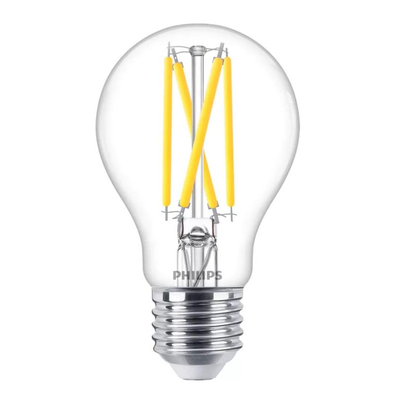 MASTER-Glühlampen DimTone Dimmeffekt dimmen wie die klassischen Glühlampen: Ihr Licht wird beim Dimmen wärmer (2700-2200K). Sie bieten außerdem erhebliche Energieeinsparungen, da sie im Vergleich zu normalen LED-Lampen 30 % weniger Energie verbrauchen. Mit einer Lebensdauer von 25.000 Stunden verringern diese dimmbaren Glas-LED-Lampen auch die Wartungskosten.