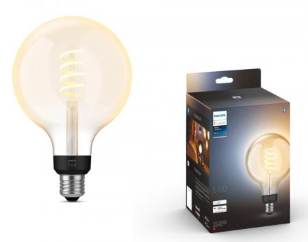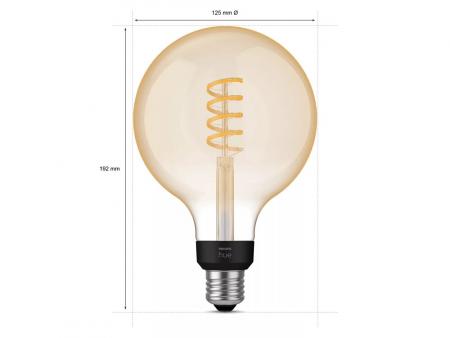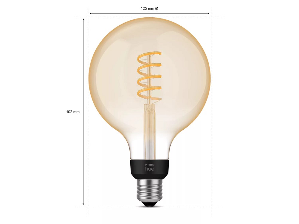 Die Philips Hue G125 Vintage Style Smart Lamp ist die größte und beeindruckendste Lampe in der Produktreihe der intelligenten Hue Beleuchtung. Sie hat ein warm- bis kaltweißes Licht, einen eleganten Spiralfaden und einen Standard-E27-Sockel.