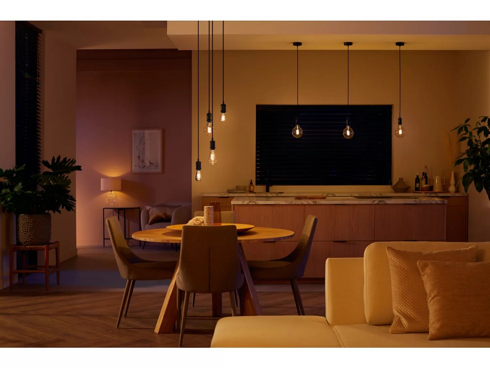 Die Hue Lampe ist eine moderne Leuchte mit traditionellem Design. Verwenden Sie sie, um das perfekte Ambiente in Ihrem Zuhause zu schaffen. Trotz Vintage-Stil ist ist Bluetooth-fähig, hat einen gewickelten Glühfaden und eine schicke bernsteinfarbene Beschichtung. Verwenden Sie sie mit Bluetooth oder verbinden Sie sie mit einer Hue Bridge für weitere intelligente Beleuchtungsfunktionen.