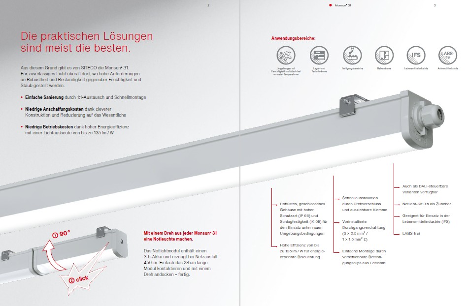 Monsun® 31 ist die effiziente, robuste und zugleich zuverlässige Lichtlösung für Sanierungsprojekte und Neuinstallationen. Problemlose Nutzung vorhandener Befestigungspunkte durch flexibel positionierbare Befestigungsclips für eine einfache Montage, geringer Installationsaufwand durch Weiterverdrahtung zur nächsten Leuchte und ein robustes Gehäuse für anspruchsvolle Umgebungen.