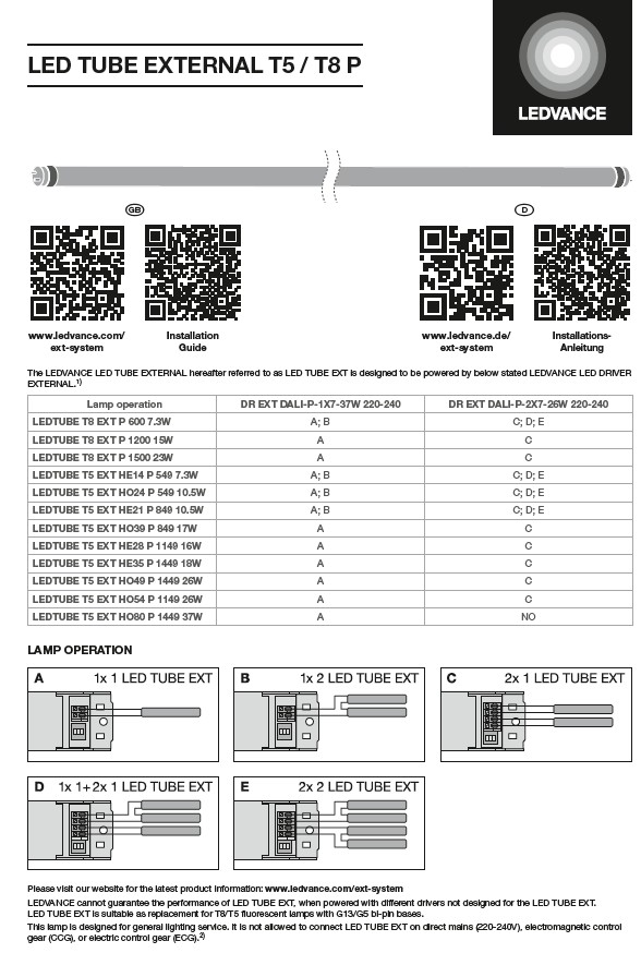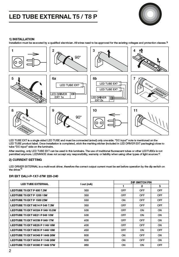 Betriebsart: EXT (ausgelegt für LEDVANCE LED DRIVER LED TUBE EXTERNAL DALI P)