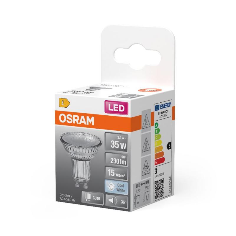 Der OSRAM STAR GU10 / PAR16 LED-Strahler 2,4W 36° klar neutralweiß wie 35W ist der perfekte Ersatz für Ihre Halogen-Reflektorlampen / Spots / Strahler. Er bietet eine hochwertige LED Alternative mit einem Lichtstrom von 230lm und einer Farbtemperatur von 4000K.