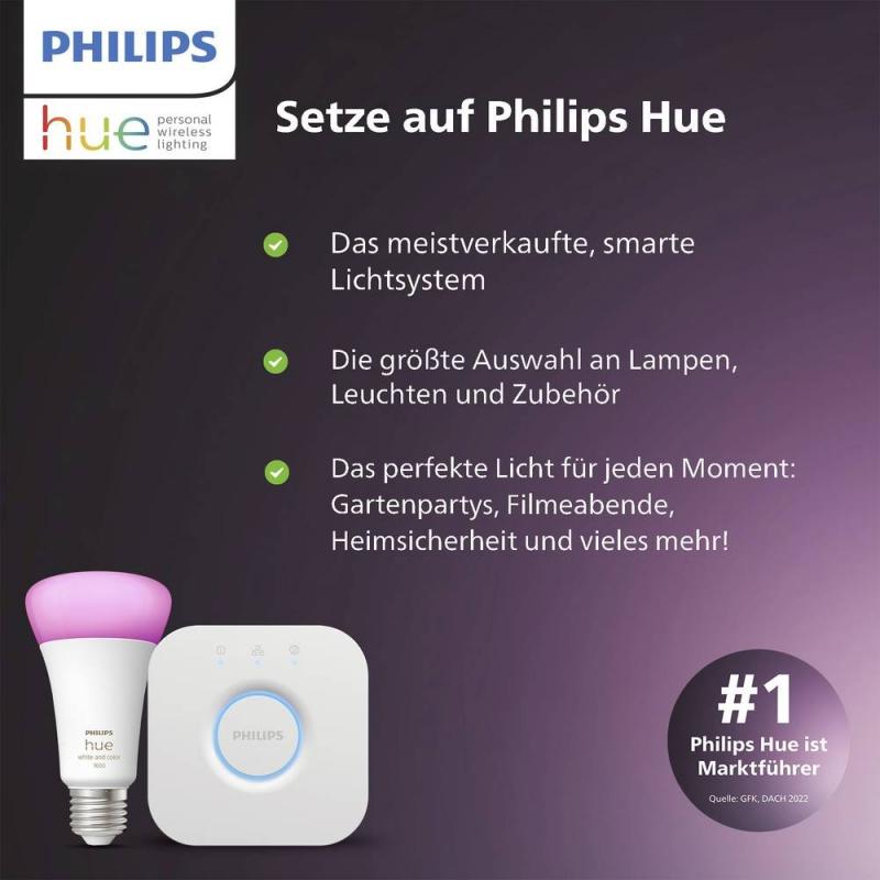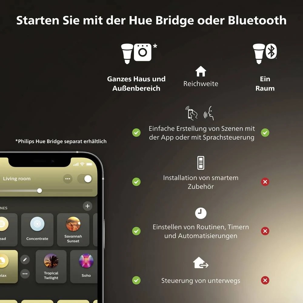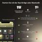 Praktisch: Die Steuerung der Beleuchtung ist mit der entsprechenden App über Bluetooth möglich. Es können insgesamt 10 Leuchten mit der App angesteuert werden. Außerdem kann das Leuchtmittel als Erweiterung zu einem passenden Starter-Set mit Dimmschalter genutzt und gesteuert werden. Zur Nutzung einer Sprachsteuerung mittels Amazon Alexa, Google Assistant, Apple HomeKit oder Microsoft Cortana ist die Verbindung mit einer extra erhältlichen Philips Hue Bridge notwendig. Durch Nutzung der Bridge ist eine Steuerung von daheim oder unterwegs und viele Lichtsteuerungen bei bis zu maximal 50 Leuchtmitteln im ganzen Wohnraum möglich.