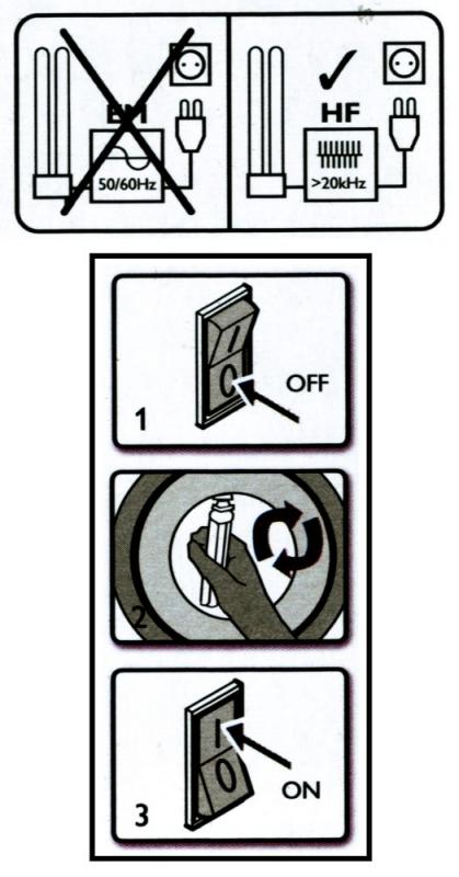 Die Philips CorePro LED PLC für EVG ist mit gängigen EVGs von Markenherstellern kompatibel. Eine Liste getesteter EVGs finden Sie unter www.philips.de/master-led-lampen. Nicht geeignet für vertikale Brennstellungen. Rotierende Endkappen