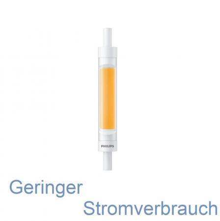 Mit dieser sparsamen schlanken Lampe beleuchten Sie Ihre Umgebung mit einem angenehmen warmweißen und nicht störenden Licht. Die Lampe hat eine Gesamtlänge von 118 mm, einen Durchmesser von 15 mm und eine Energieeffizienzklasse E. Sie erzeugt eine Gesamtlichtausbeute von 118 Lumen pro Watt. Der Artikel zeichnet sich durch einen Spannungsbereich von 220-240 V aus. Die R7s-Fassung erleichtert das Anbringen des Produkts.