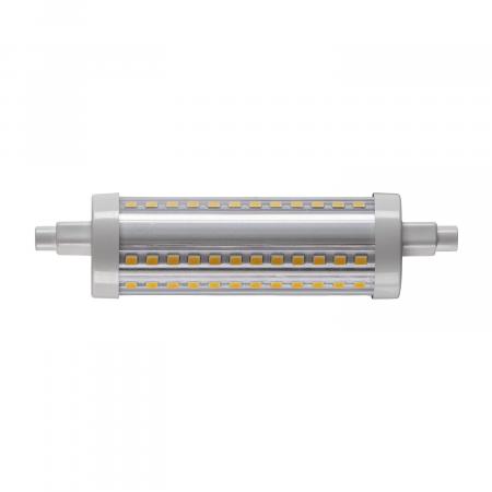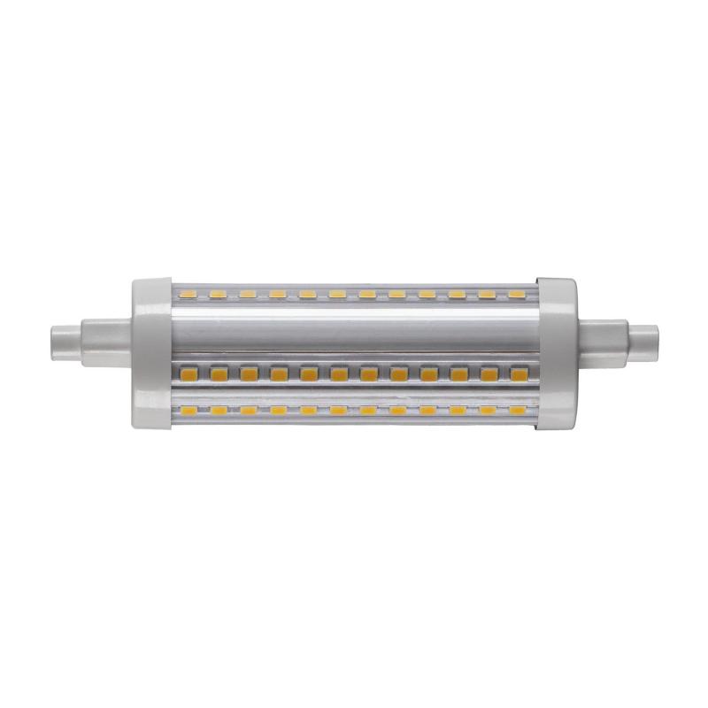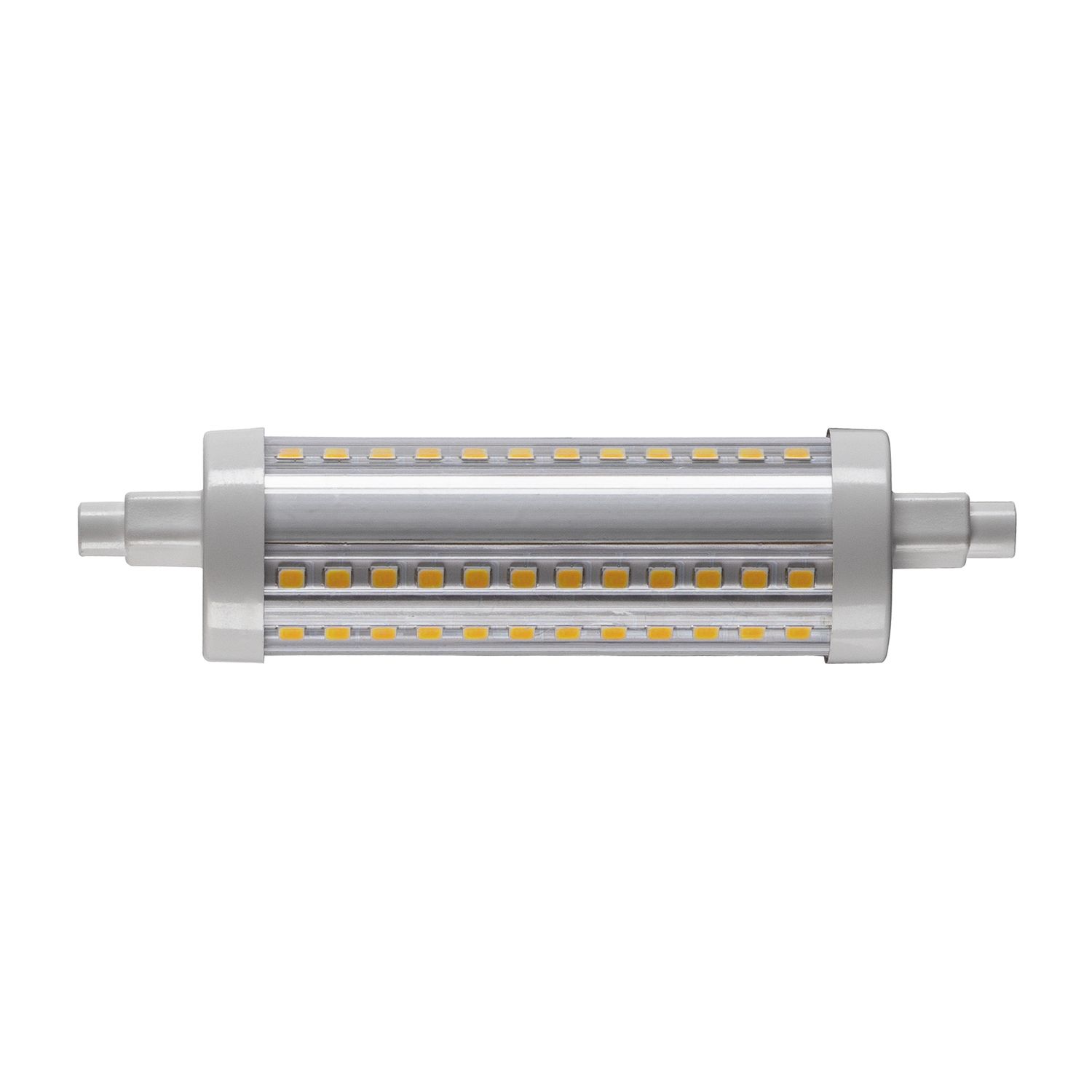 Das transparente 15W SLV SMD LED Leuchtmittel mit R7S 118mm Sockel und QT DE12 Form ist dimmbar, hat einen einen CRI-Wert von 90, 800 Lumen sowie eine Lebensdauer von 25.000 Stunden. Diese Version hat einen Abstrahlwinkel von 330° und hat 3.000 Kelvin.