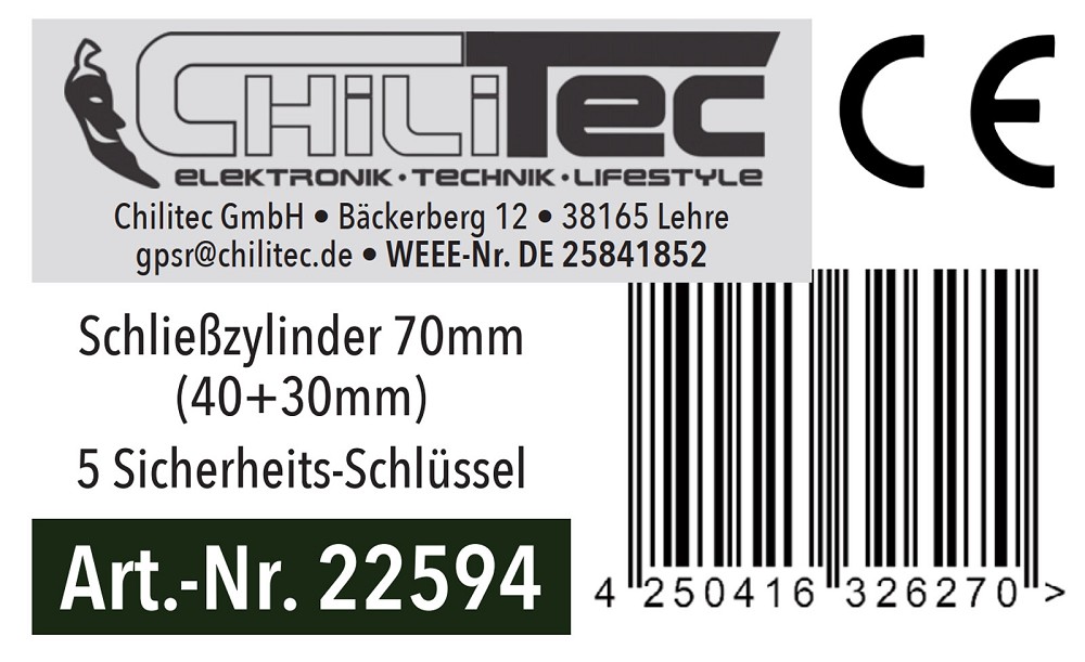 ChiliTec Schließzylinder 70mm (40+30mm) Profil-Zylinder, 5 Sicherheits-Schlüssel