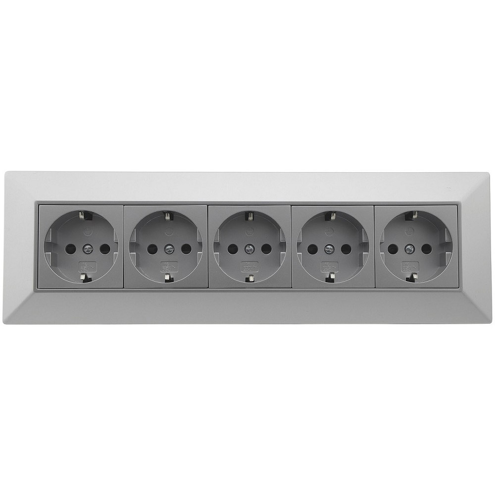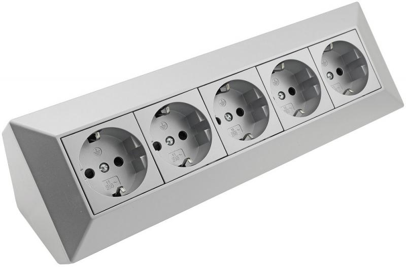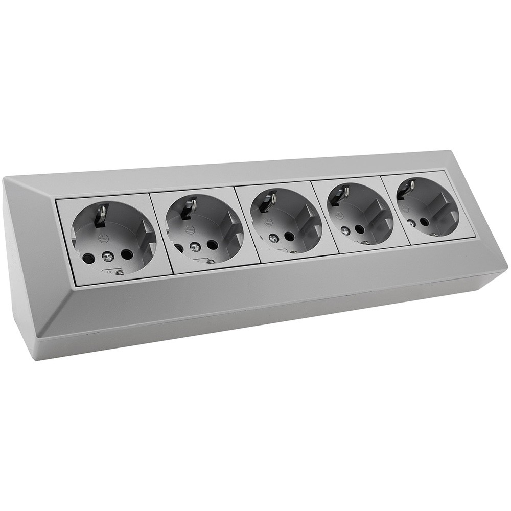 Aufbau-Steckdose mit 5 Schutzkontakt-Steckdosen, 45° gewinkelt für optimale Ausnutzung der Steckplätze. Dreieck Design entworfen und konstruiert um auf den Arbeitsflächen mehr Platz für das Wesentliche zu schaffen. Das Gehäuse ist um 90° gewinkelt und ideal für die Installation in Ecken, Auf Arbeitsflächen oder als Unterbausteckdose unter dem Küchenschrank. Technische Details: