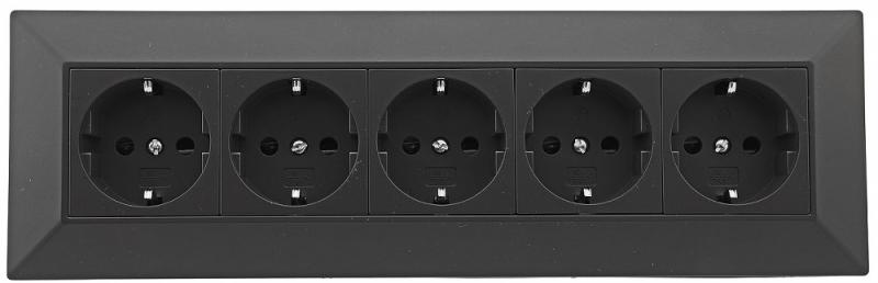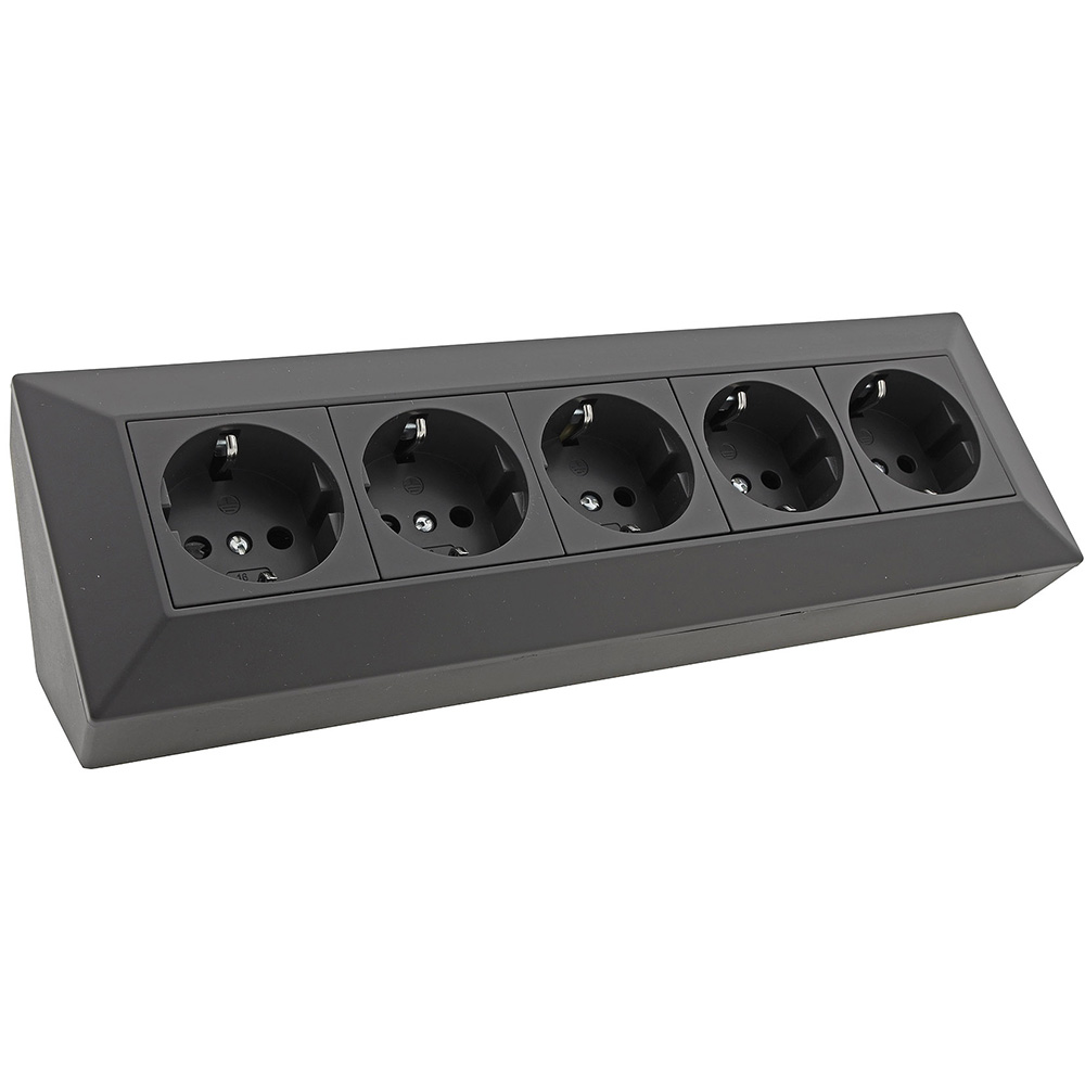 Aufbau-Steckdose mit 5 Schutzkontakt-Steckdosen, 45° gewinkelt für optimale Ausnutzung der Steckplätze. Dreieck Design entworfen und konstruiert um auf den Arbeitsflächen mehr Platz für das Wesentliche zu schaffen. Das Gehäuse ist um 90° gewinkelt und ideal für die Installation in Ecken, Auf Arbeitsflächen oder als Unterbausteckdose unter dem Küchenschrank. Technische Details: