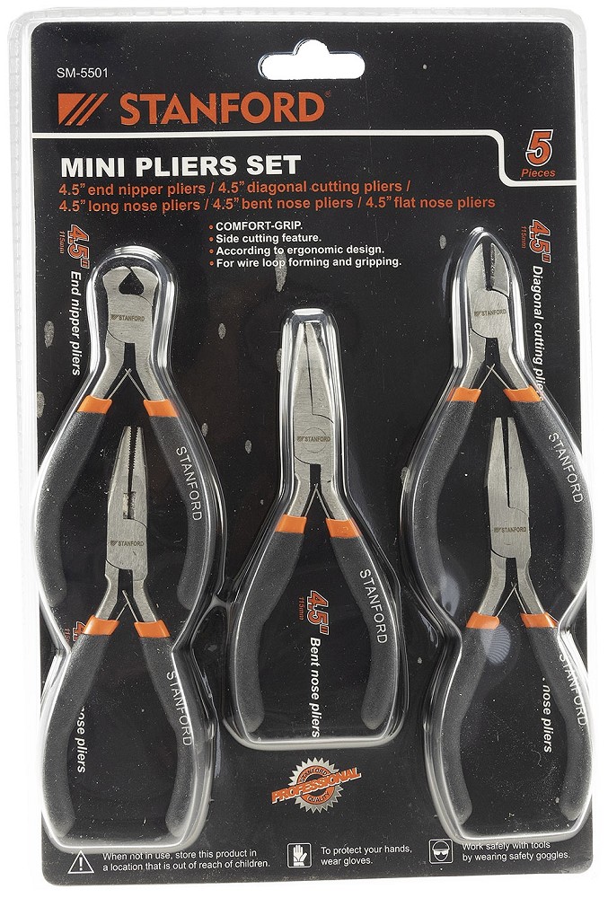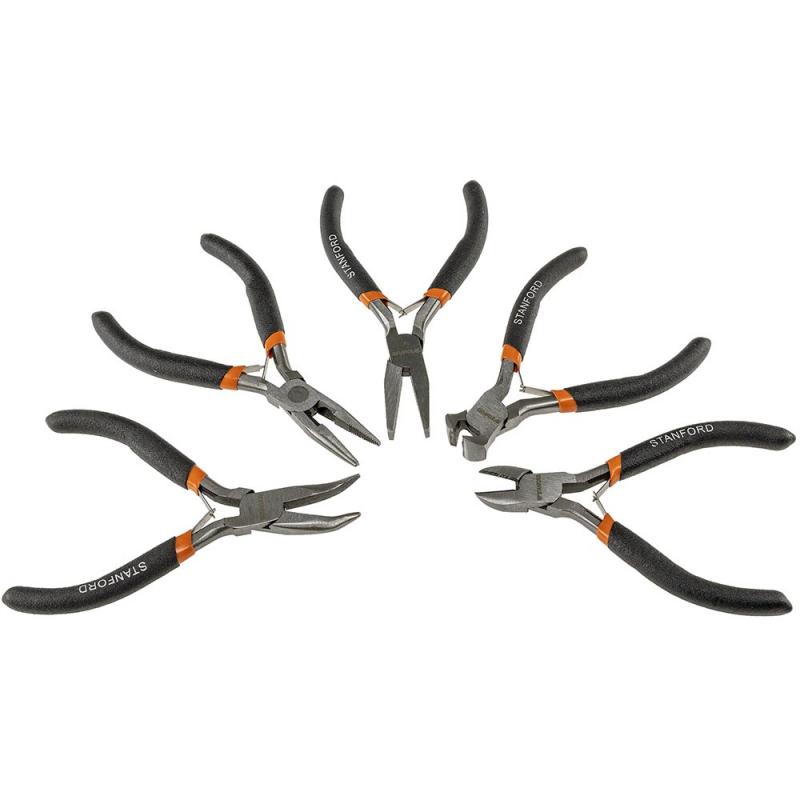 Sehr praktisches Set mit fünf 12cm-Zangen für Elektronik, Feinmechanik und Hobby. Das Set enthält: Seitenschneider, Spitzzange, abgewinkelten Spitzzange, Kneifzange und Flachzange • isolierte Griffe • federöffnend