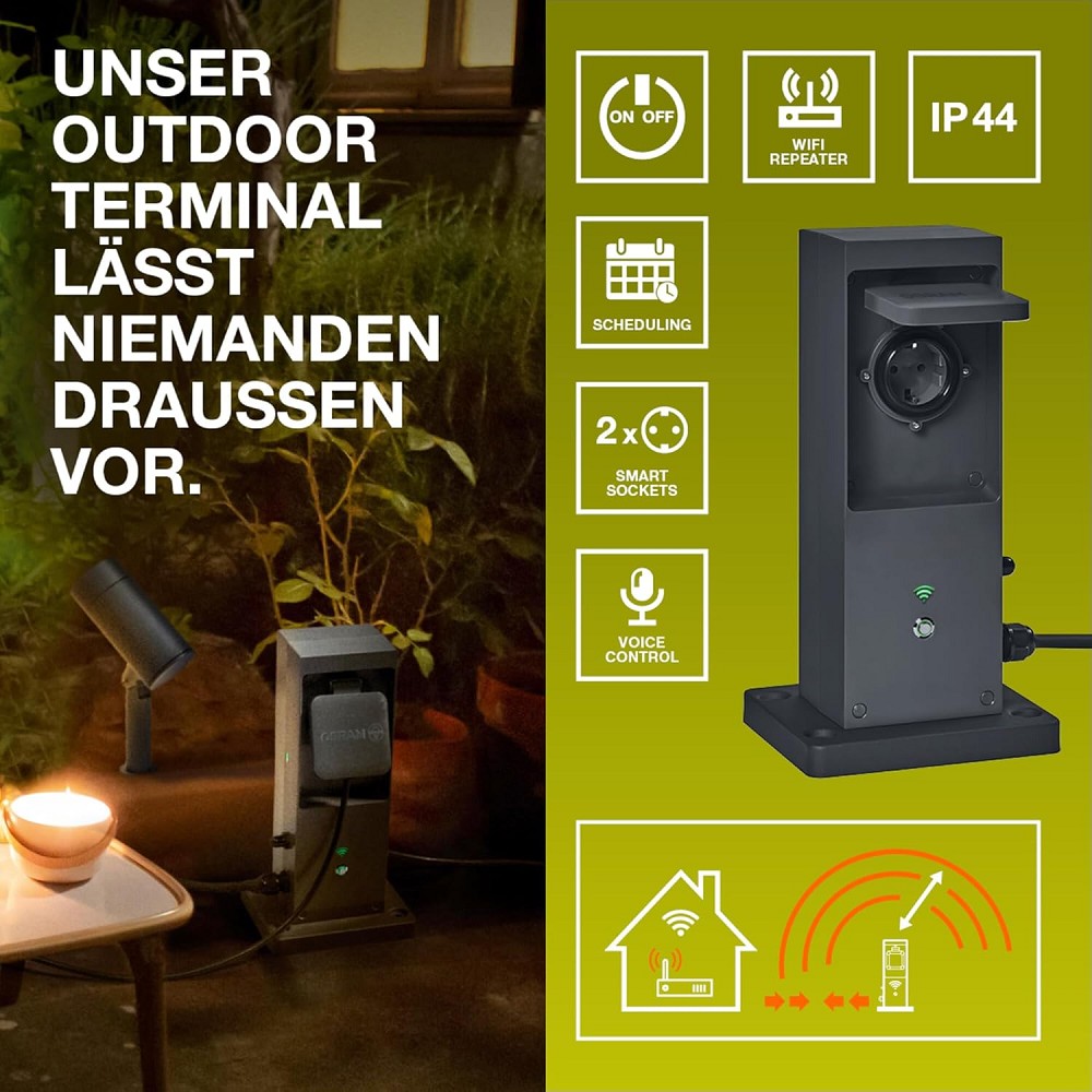 Outdoor-Terminal mit integriertem WLAN-Repeater und zwei smarten Steckdosen. Produkteigenschaften: Sprachsteuerung verfügbar: Google Assistant und Amazon Alexa. Zwei smarte Standardsteckdosen können individuell angesteuert werden. Hohe Schaltleistung: bis zu 3.680 W / 16 A. Netzwerkprotokoll: WiFi (2,4 GHz). Schutzart: IP44. Zeitplanung. Steuerbar mit der SMART+ App (mit Minimum Android 8.0 oder iOS 14.0). Produktvorteile: Integrierter WLAN-Repeater erweitert die WLAN-Zone im Freien auf bis zu 45 Meter. WiFi Repeater ermöglicht das Koppeln anderer drahtloser Geräte mit WLAN bis zu 15 Geräten. Hoher Sicherheitsstandard: Überlastschutz, Überspannungsschutz. Integriert konventionelle Elektrogeräte in kompatible Smart-Home-Systeme. Ermöglicht das ferngesteuerte Schalten herkömmlicher Lichtquellen und anderer elektrischer Geräte. Anwendungsgebiete: Wo immer nicht-smarte Geräte in ein kompatibles Smart-Home-System integriert werden sollen. Gärten, Balkone und andere Außenbereiche. Technische Ausstattung: Erdspieß enthalten für einfache Befestigung im Gartenboden. 3 Meter langes Stromkabel für flexible Installation. Inklusive Kabelverbinder, falls das Netzkabel verlängert werden muss. Für die Steuerung mit der SMART+ App wird ein Handy oder Tablet (mit Minimum Android 8.0 oder iOS 14.0) benötigt. Sicherheitshinweise: Geräte mit Wärmeentwicklung nach Benutzung vom Netz, d.h. vom SMART+ Outdoor Terminal, trennen, um versehentliches Einschalten zu vermeiden.. Sehr große kapazitive und induktive Lasten können in ungünstigen Fällen zur Zerstörung des Gerätes führen oder die Zahl der Schaltzyklen reduzieren.. Verwenden Sie den SMART+ Outdoor Terminal nicht in Verbindung mit medizinischen Geräten.. Produkt der Schutzklasse I. Alle elektrisch leitfähigen, metallischen Gehäuseteile, die im Betrieb oder während der Wartung im Fehlerfall Spannung aufnehmen können, müssen durchgängig mit dem Schutzleiter verbunden sein.