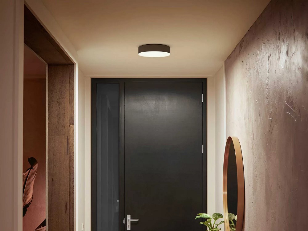 Diese kleine Hue Enrave Deckenleuchte in Schwarz wirft einen sanften Lichtring nach unten. Sie beleuchtet damit optimal kleinere Flächen wie Eingangsbereiche. Mit ihrem modernen Design und der Auswahl an weißem Licht passt sie in jedes Zuhause.