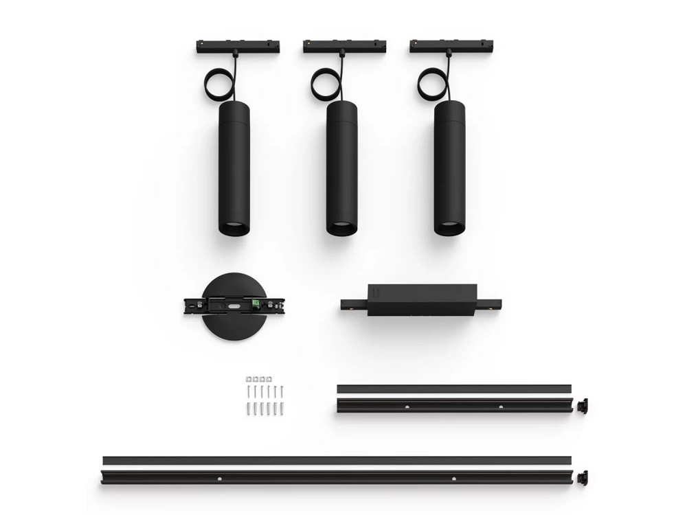 Dieses Schienenbeleuchtungsset für die Decke in Schwarz enthält drei Pendelleuchten, eine 1 Meter und eine 0,5 Meter lange Schiene und ein zwischen den beiden Schienen befindliches Netzteil.