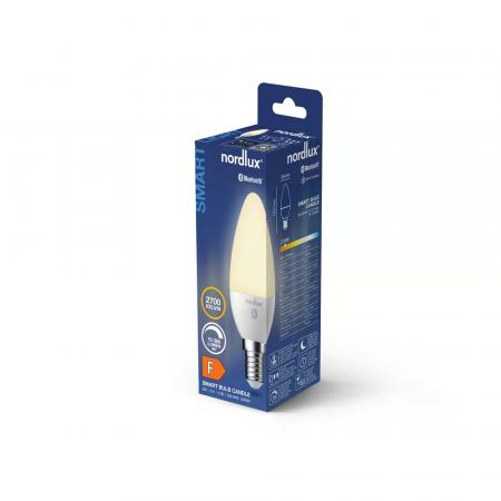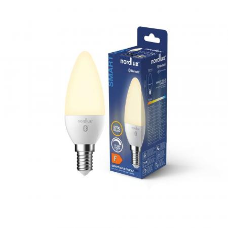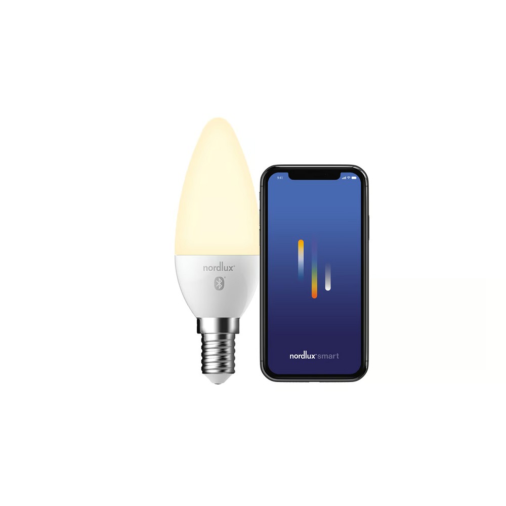 Smart-E14-Leuchtmittel in Kerzenform mit warmweißem Licht. Mit Ihrem Smartphone oder Tablet können Sie die Helligkeit verringern oder erhöhen, oder Sie fügen eine Smart-Fernbedienung hinzu, wenn Sie Ihre Beleuchtung ohne Smartphone steuern möchten.