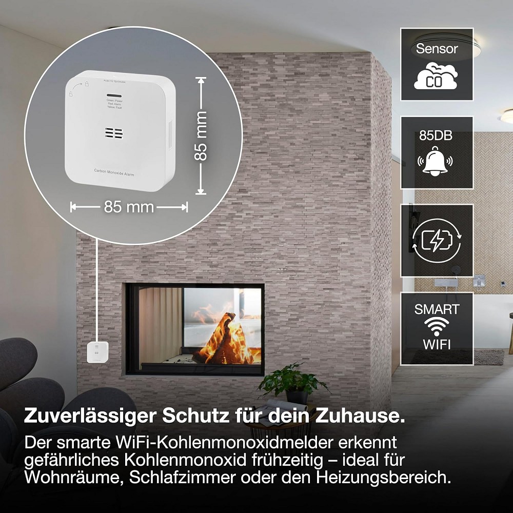 - Dreifach-Alarmfunktion mit lautem akustischem Alarm (>85 dB), rot blinkenden Warnleuchten und Push-Benachrichtigung über Smart Home-Apps