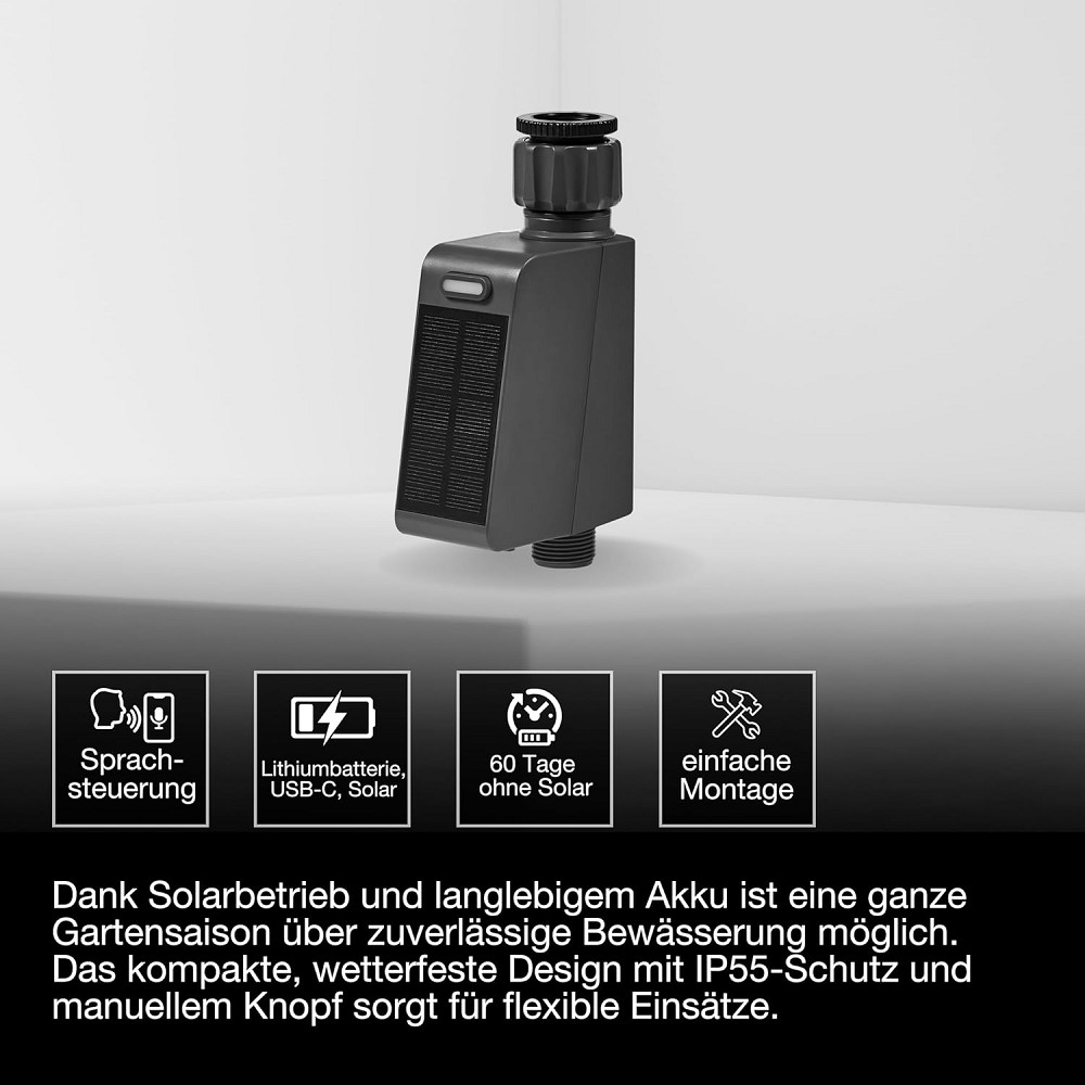 - Integrierte Solarzelle und per USB-C wiederaufladbare Batterie für eine lange Batterielebensdauer durch die Bewässerungssaison