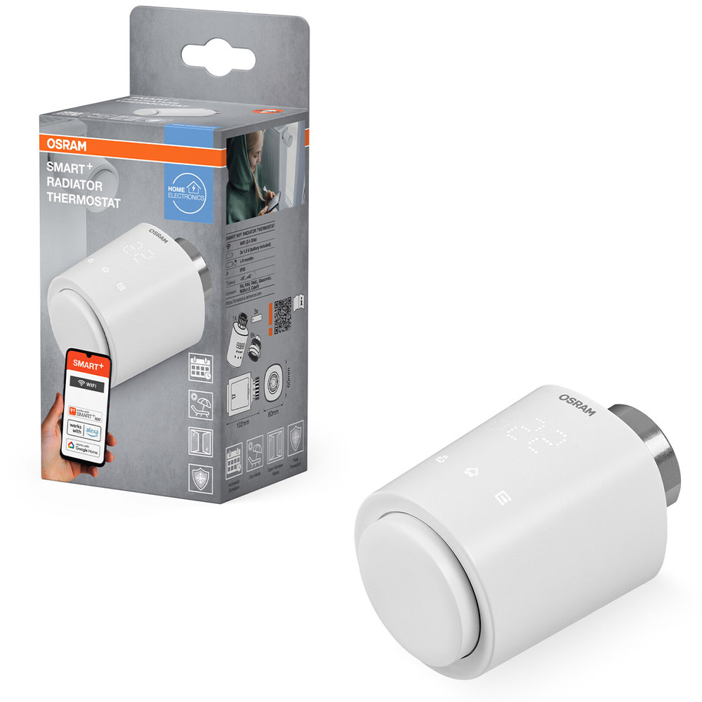 SMART+ Heizkörperthermostat mit WiFi-Technologie. Produkteigenschaften: Kompatibel mit Amazon Alexa und Google Home. Gewinde für Heizungsventile M30x1,5 und mit den mitgelieferten Adaptern kompatibel mit M28x1,5, Danfoss RA, Danfoss RAV, Danfoss RAVL, Giacomini und Caleffi Ventile. Netzwerkprotokoll: WiFi (2,4 GHz). Steuerbar mit der SMART+ App (mit Minimum Android 8.0 oder iOS 14.0). Produktvorteile: Smartes Thermostat heizt nach individuellem Bedarf und kann über Zeitpläne, Automatisierungen und Routinen konfiguriert werden. Automatischer Modus: Benutzerdefinierte Zeitpläne auf der Grundlage eines Zeitplans oder verschiedener smarter Routinen. Manueller Modus: Ändere die Temperatur jederzeit entsprechend über die App oder direkt am Heizkörperthermostat. Urlaubsmodus: Senke die Temperatur dauerhaft ab, wenn über einen längeren Zeitraum niemand zu Hause ist. Erkennung offener Fenster: Automatische Erkennung und Abschaltung des Heizkörpers bei geöffnetem Fenster. Automatische Kalibrierung: Stellt sich automatisch auf das Heizkörperventil ein und sorgt für eine optimale Regelung. Temperaturverlauf: Überwachen Sie den detaillierten Verlauf der Temperatur. Verkalkungsschutz: Bewegt das Heizkörperventil in regelmäßigen Abständen, um Verkalkung zu verhindern. Leiser Betrieb: Der leise Motor sorgt auch in ruhigen Umgebungen für wenig störende Geräusche. Lange Batterielebensdauer: Batterielebensdauer für eine ganze Heizperiode (>9 Monate). Anwendungsgebiete: Smart Home im Innenbereich. Technische Ausstattung: Batterie enthalten (3x AA). Sicherheitshinweise: Batteriewarnung: Außerhalb der Reichweite von Kindern aufbewahren. Das Verschlucken kann zu Verätzungen, Perforation von Weichgeweben und zum Tode führen. Innerhalb von 2 Stunden ab dem Verschlucken kann es zu schweren Verbrennungen kommen. Suchen Sie sofort einen Arzt auf.. Wenn das Batteriefach (falls zutreffend) nicht sicher schließt, verwenden Sie das Produkt bitte nicht mehr und halten Sie es von Kindern fern. Wenn Sie glauben, dass eventuell Batterien verschluckt wurden oder in ein Körperteil gelangt sind, suchen Sie sofort einen Arzt auf.. Bitte vermeiden: Maximale Umgebungstemperatur: +35 °C. Das Ersetzen einer Batterie durch einen falschen Typ kann die Sicherheitsvorkehrungen außer Kraft setzen (z. B. bei einigen Lithium-Batterietypen). Höhe im Betrieb: 2000 m. Entsorgung einer Batterie im Feuer oder in einem heißen Ofen oder das mechanische Zerkleinern oder Schneiden einer Batterie kann zu einer Explosion führen.